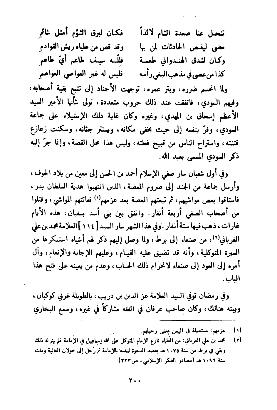 وَفِي اول شعْبَان سَار صفي الْإِسْلَام أَحْمد بن الْحسن إِلَى معِين من بِلَاد الْجوف وَأرْسل جمَاعَة من الْجند إِلَى صروم المعضة الَّذين انتهبوا هَدِيَّة السُّلْطَان بدر فَاسْتَاقُوا بعض مَوَاشِيهمْ ثمَّ تبعتهم المعضة بعد عزمهم ففاتتهم الْمَوَاشِي وَقتلُوا من أَصْحَاب الصفي أَرْبَعَة أَنْفَار وَاتفقَ بَين بني أَسد بسفيان هَذِه الْأَيَّام غارات ذهب فِيهَا سِتَّة أَنْفَار وَفِي هَذَا الشَّهْر سَار السَّيِّد الْعَلامَة مُحَمَّد بن عَليّ الغرباني من صنعاء إِلَى برط وَلما وصل إِلَيْهِم ذكر لَهُم أَشْيَاء استنكرها من السِّيرَة المتوكلية وَأَنه قد تضيق عَلَيْهِ الْقيام وَعَلَيْهِم الْإِجَابَة والإنعام وَآل أمره إِلَى الْعود إِلَى صنعاء لانخرام ذَلِك الْحساب وَعدم من يُعينهُ على فتح هَذَا الْبَاب