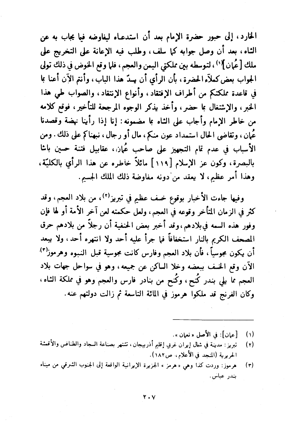 وَمن الْأَسْبَاب فِي عدم تَمام التَّجْهِيز على صَاحب عمان عقابيل فتْنَة حُسَيْن باشا بِالْبَصْرَةِ وَكَون عز الْإِسْلَام (119) مائلا خاطره عَن هَذَا الرَّأْي بِالْكُلِّيَّةِ وَهَذَا أَمر عَظِيم لَا يعْقد من دونه مُفَاوَضَة ذَلِك الْملك الجسيم
