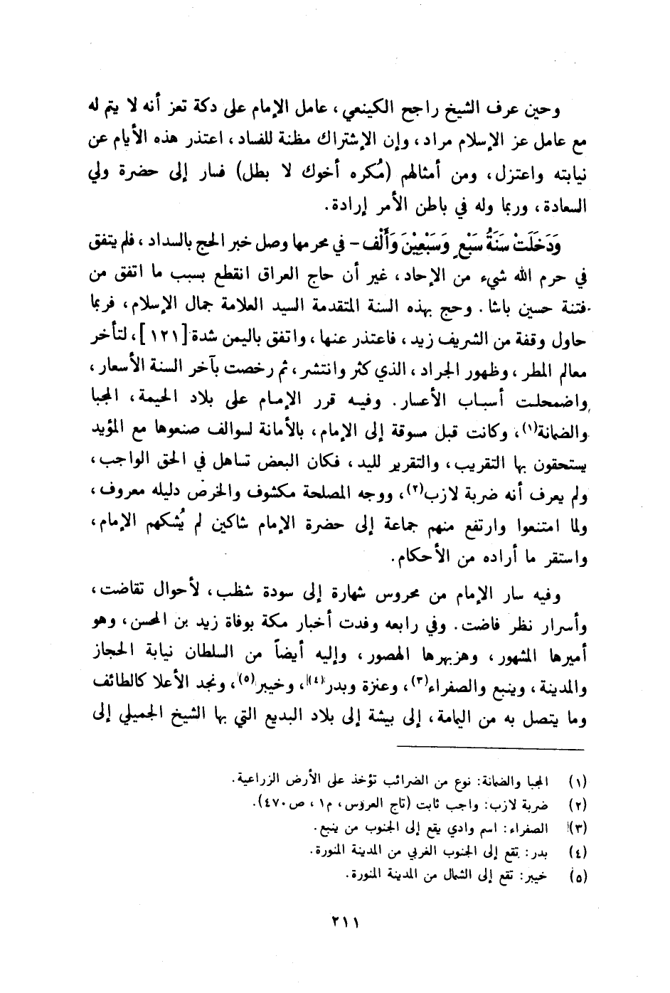 وَفِيه قرر الإِمَام على بِلَاد الحمية المجبا والضمانة وَكَانَت قبل مسوقة إِلَى الإِمَام بالأمانة لسوالف صنعوها مَعَ الْمُؤَيد يسْتَحقُّونَ بهَا التَّقْرِيب والتقرير لليد فَكَانَ الْبَعْض تساهل فِي الْحق الْوَاجِب وَلم يعرف أَنه ضَرْبَة لازب وَوجه الْمصلحَة مَكْشُوف والخرص دَلِيله مَعْرُوف وَلما امْتَنعُوا وارتفع مِنْهُم جمَاعَة إِلَى حَضْرَة الإِمَام شاكين لم يشكهم الإِمَام وَاسْتقر مَا أَرَادَهُ من الْأَحْكَام