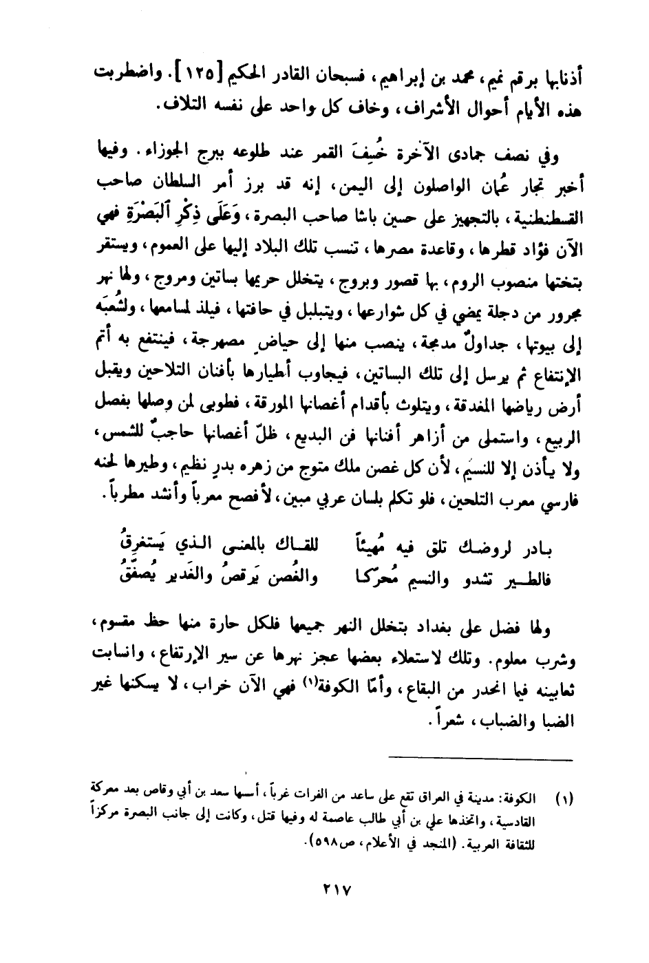 وفيهَا أخبر تجار عمان الواصلون إِلَى الْيمن إِنَّه قد برز أَمر السُّلْطَان صَاحب القسطنطنية بالتجهيز على حُسَيْن باشا صَاحب الْبَصْرَة وعَلى ذكر الْبَصْرَة فَهِيَ الْآن فؤاد قطرها وَقَاعِدَة مصرها تنْسب تِلْكَ الْبِلَاد إِلَيْهَا على الْعُمُوم ويستقر بتختها مَنْصُوب الرّوم بهَا قُصُور وبروج يَتَخَلَّل حريمها بساتين ومروج وَلها نهر مجرور من دجلة يمْضِي فِي كل شوارعها ويتبلبل فِي حافتها فيلذ لمسامعها ولشعبه إِلَى بيوتها جداول مدمجة ينصب مِنْهَا إِلَى حِيَاض مصهرجة فينتفع بِهِ أتم الإنتقاع ثمَّ يُرْسل إِلَى تِلْكَ الْبَسَاتِين فيجاوب أطيارها بأفنان التلاحين وَيقبل أَرض رياضها المغدقة ويتلوث بأقدام أَغْصَانهَا المورقة فطوبى لمن وَصلهَا بِفضل الرّبيع واستملى من أزاهر أفنانها فن البديع ظلّ أَغْصَانهَا حَاجِب للشمس وَلَا يَأْذَن إِلَّا للنسيم لِأَن كل غُصْن ملك متوج من زهره بدر نظيم وطيرها لحنه فَارسي مُعرب التلحين فَلَو تكلم بِلِسَان عَرَبِيّ مُبين لأفصح معربا وَأنْشد مطربا