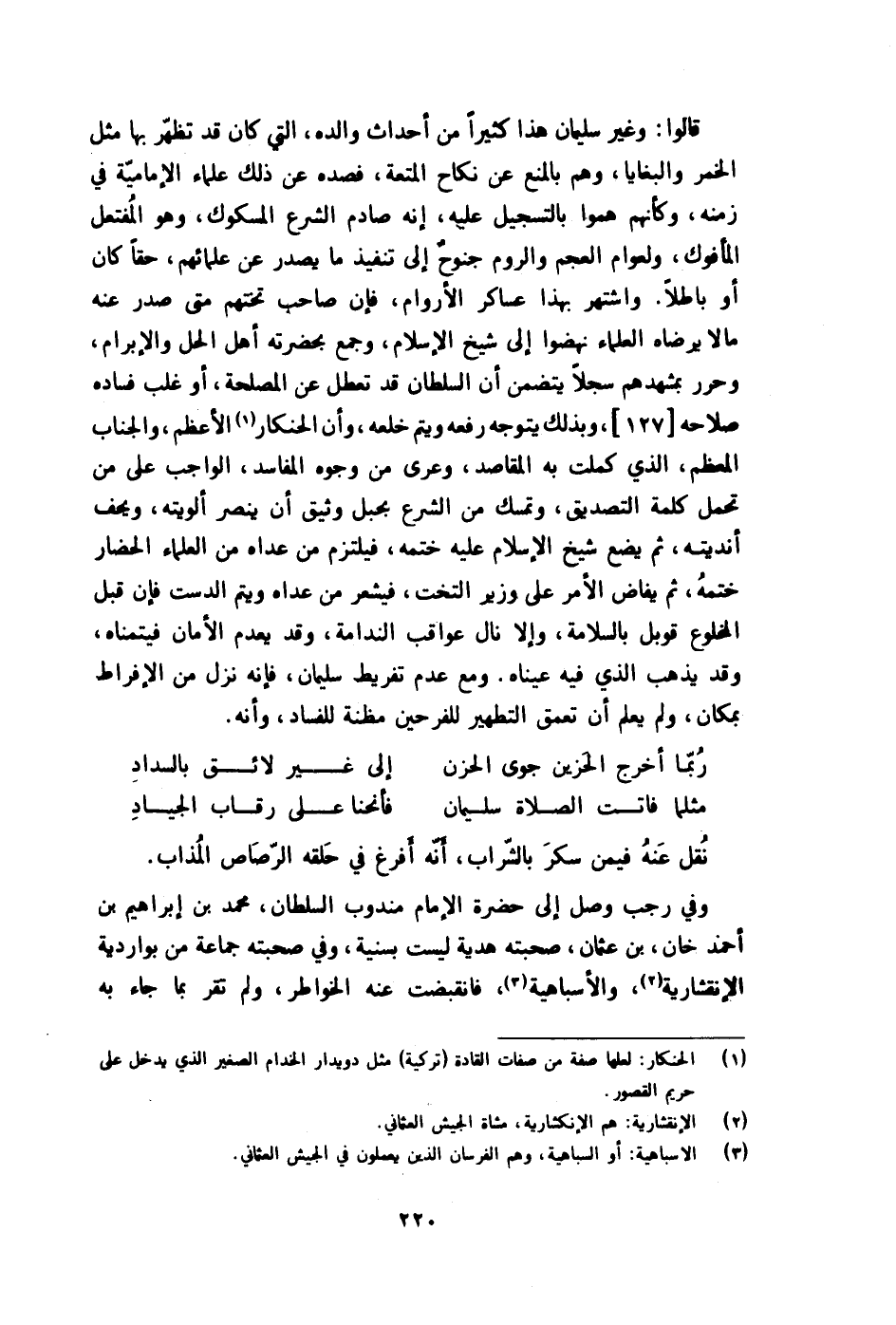 قَالُوا وَغير سُلَيْمَان هَذَا كثيرا من أَحْدَاث وَالِده الَّتِي كَانَ قد تطهر بهَا مثل الْخمر والبغايا وهم بِالْمَنْعِ عَن نِكَاح الْمُتْعَة فصده عَن ذَلِك عُلَمَاء الإمامية فِي زَمَنه وَكَأَنَّهُم هموا بالتسجيل عَلَيْهِ إِنَّه صادم الشَّرْع المسكوك وَهُوَ المفتعل المأفوك ولعوام الْعَجم وَالروح جنوح إِلَى تَنْفِيذ مَا يصدر عَن عُلَمَائهمْ حَقًا كَانَ أَو بَاطِلا