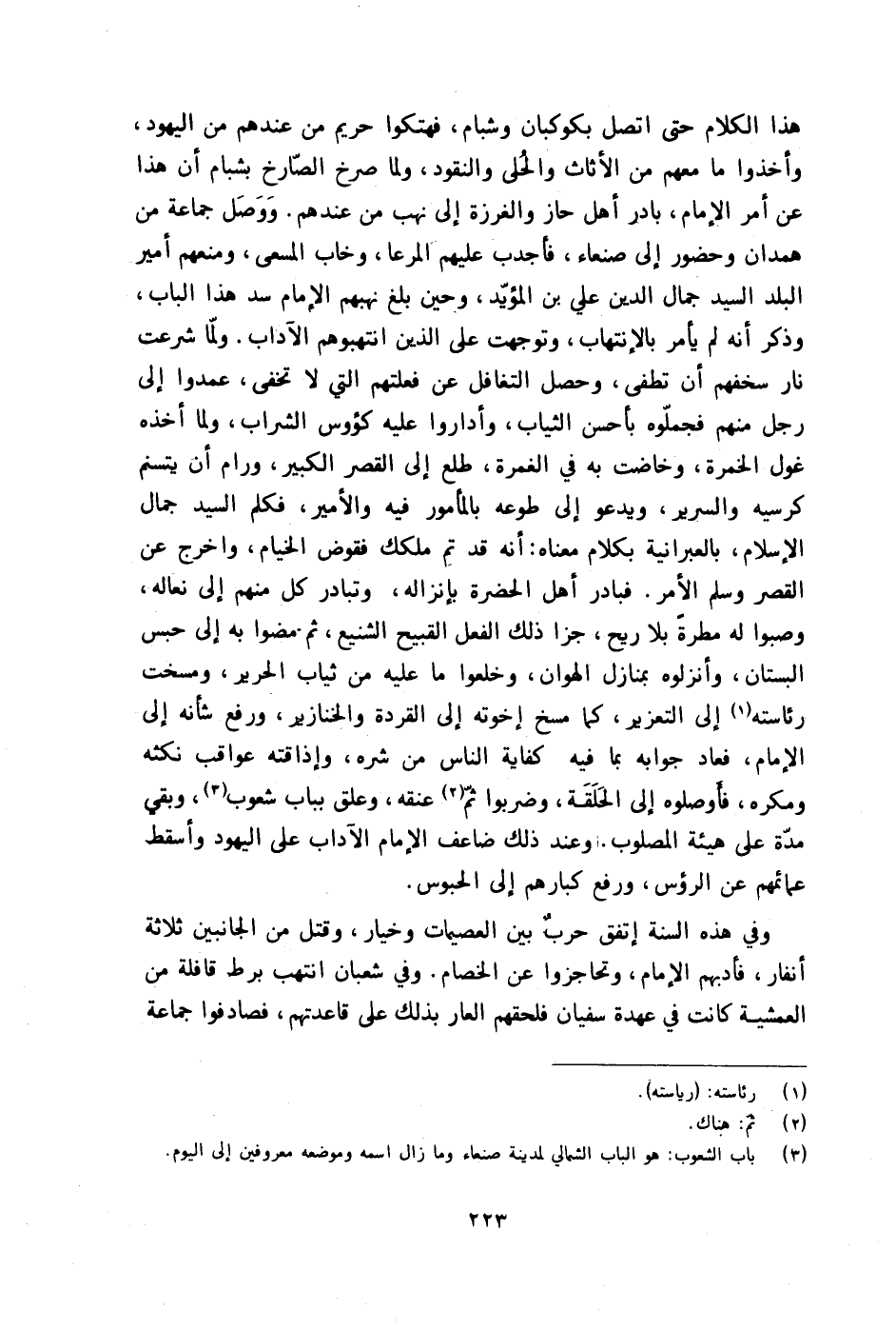 هَذَا الْكَلَام حَتَّى اتَّصل بكوكبان وشبام فهتكوا حَرِيم من عِنْدهم من الْيَهُود وَأخذُوا مَا مَعَهم من الأثاث والحلى والنقود وَلما صرخَ الصَّارِخ بشبام أَن هَذَا عَن أَمر الإِمَام بَادر أهل حَاز والغرزة إِلَى نهب من عِنْدهم