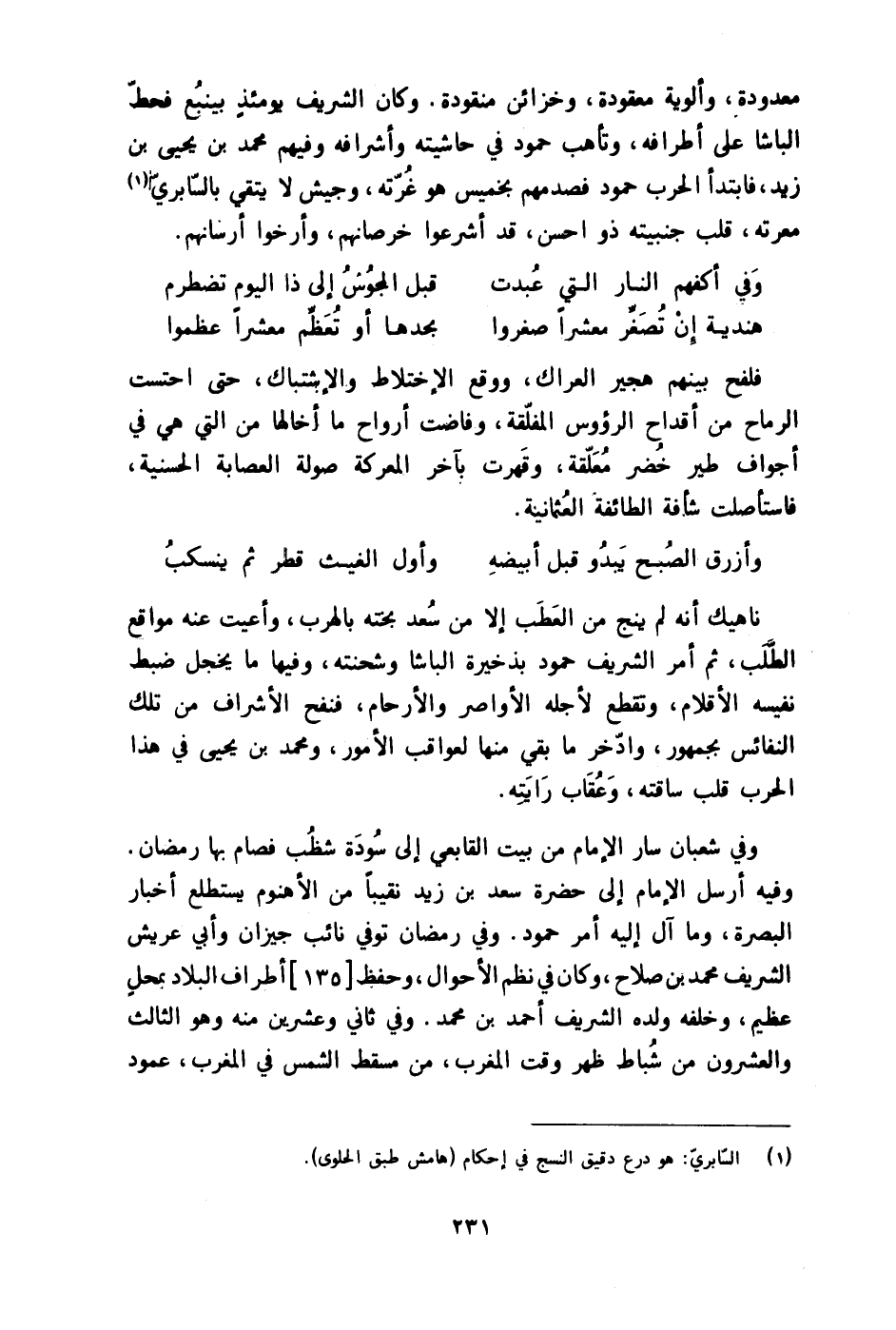 وَكَانَ الشريف يَوْمئِذٍ بينبع فحط الباشا على أَطْرَافه وتأهب حمود فِي حَاشِيَته وأشرافه وَفِيهِمْ مُحَمَّد بن يحيى بن زيد فابتدأ الْحَرْب حمود فصدمهم بخميس هُوَ غرته وجيش لَا يَتَّقِي بالسابري معرته قلب جنبيته ذُو أحسن قد أشرعوا خرصانهم وأرخوا أرسانهم