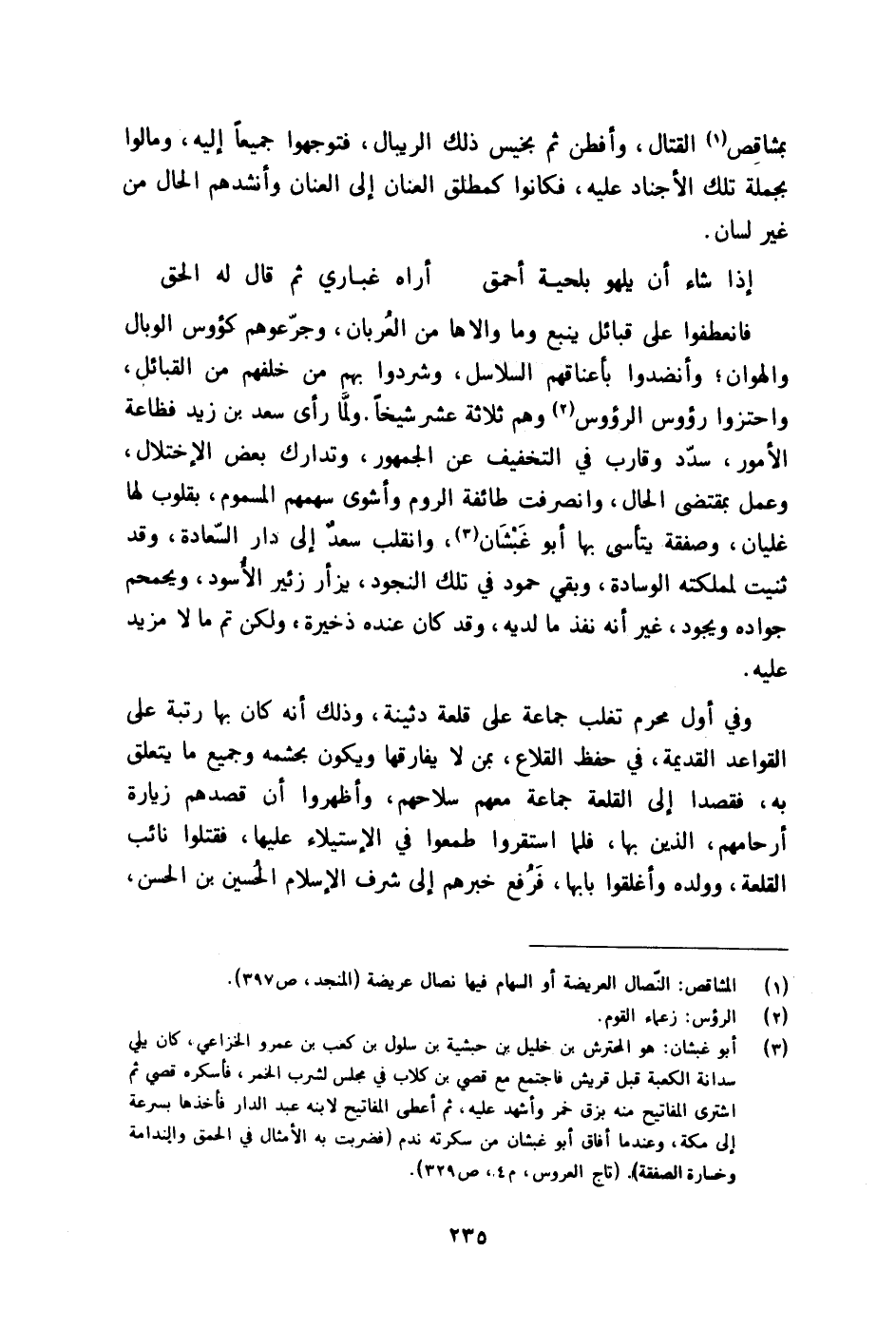 وَلما رأى سعد بن زيد فظاعة الْأُمُور سدد وقارب فِي التَّخْفِيف عَن الْجُمْهُور وتدارك بعض الاختلال وَعمل بِمُقْتَضى الْحَال وانصرفت طَائِفَة الرّوم وأشوى سهمهم المسموم بقلوب لَهَا غليان وصفقة يتأسى بهَا أَبُو غبشان وانقلب سعد إِلَى دَار السَّعَادَة وَقد ثنيت لمملكته الوسادة وَبَقِي حمود فِي تِلْكَ النجُود يزأر زئير الْأسود ويحمحم جَوَاده ويجود غير أَنه نفذ مَا لَدَيْهِ وَقد كَانَ عِنْده ذخيرة وَلَكِن تمّ مَا لَا مزِيد عَلَيْهِ