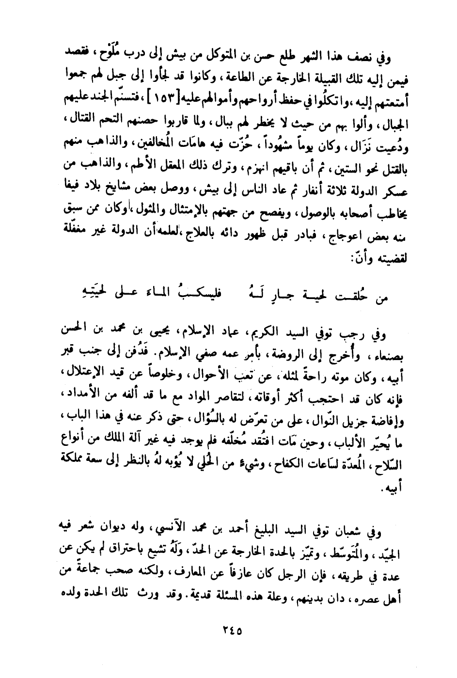 وَفِي شعْبَان توفّي السَّيِّد البليغ أَحْمد بن مُحَمَّد الآنسي وَله ديوَان شعر فِيهِ الْجيد والمتوسط وتميز بالحدة الْخَارِجَة عَن الْحَد وَله تشيع باحتراق لم يكن عَن عدَّة فِي طَرِيقه فَإِن الرجل كَانَ عازفا عَن المعارف وَلكنه صحب جمَاعَة من أهل عصره دَان بدينهم وَعلة هَذِه المسئلة قديمَة