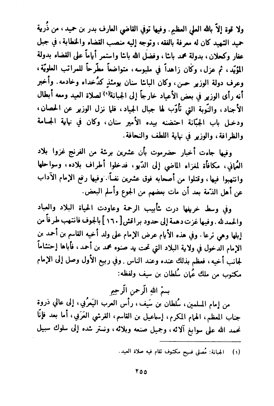 من إِمَام الْمُسلمين سُلْطَان بن سيف رَأس الْعَرَب اليعربي إِلَى عالي ذرْوَة جناب الْمُعظم الْهمام المكرم إِسْمَاعِيل بن قَاسم الْقرشِي الْعَرَبِيّ أما بعد فَإنَّا نحمد الله على سوابغ آلائه وَجَمِيل صنعه وبلائه ونستر شده إِلَى سلوك سَبِيل