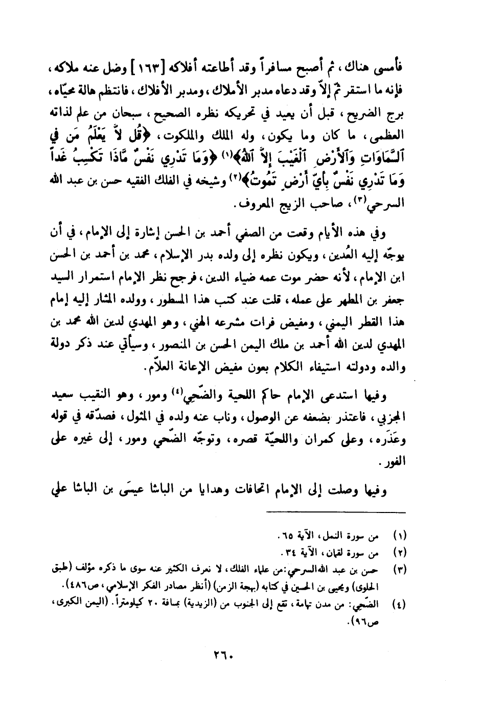 فأمسى هُنَاكَ ثمَّ أصبح مُسَافِرًا وَقد أَطَاعَته أفلاكه وضل عَنهُ ملاكه فَإِنَّهُ مَا اسْتَقر ثمَّ إِلَّا وَقد دَعَاهُ مُدبر الْأَمْلَاك ومدبر الأفلاك فانتظم هَالة محياه برج الضريح قبل أَن يُعِيد فِي تحريكه نظره الصَّحِيح سُبْحَانَ من علم لذاته الْعُظْمَى مَا كَانَ وَمَا يكون وَله الْملك والملكوت {قل لَا يعلم من فِي السَّمَاوَات وَالْأَرْض الْغَيْب إِلَّا الله} {وَمَا تَدْرِي نفس مَاذَا تكسب غَدا وَمَا تَدْرِي نفس بِأَيّ أَرض تَمُوت} وَشَيْخه فِي الْفلك الْفَقِيه حسن بن عبد الله السرحي صَاحب الزيج الْمَعْرُوف