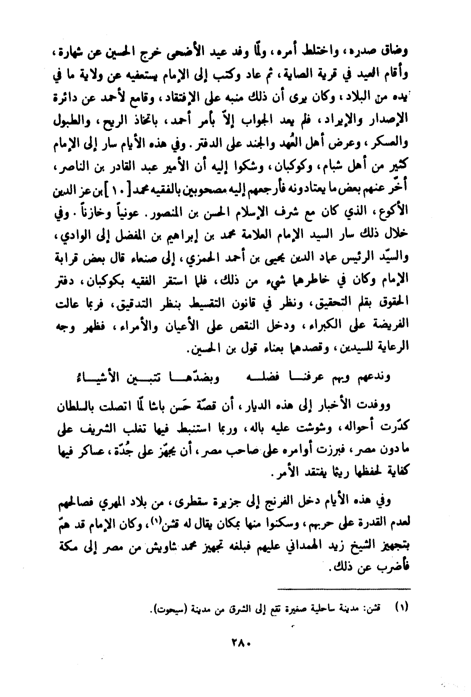 وَفِي خلال ذَلِك سَار السَّيِّد الإِمَام الْعَلامَة مُحَمَّد بن إِبْرَاهِيم بن الْمفضل إِلَى الْوَادي وَالسَّيِّد الرئيس عماد الدّين يحيى بن أَحْمد الحمزي إِلَى صنعاء قَالَ بعض قرَابَة الإِمَام وَكَانَ فِي خاطرهما شَيْء من ذَلِك فَلَمَّا اسْتَقر الْفَقِيه بكوكبان دفتر الْحُقُوق بقلم التَّحْقِيق وَنظر فِي قانون التقسيط بِنَظَر التدقيق فَرُبمَا عالت الْفَرِيضَة على الكبراء وَدخل النَّقْص على الْأَعْيَان والأمراء فَظهر وَجه الرِّعَايَة للسيدين وقصدهما بعناء قَول بن الْحُسَيْن