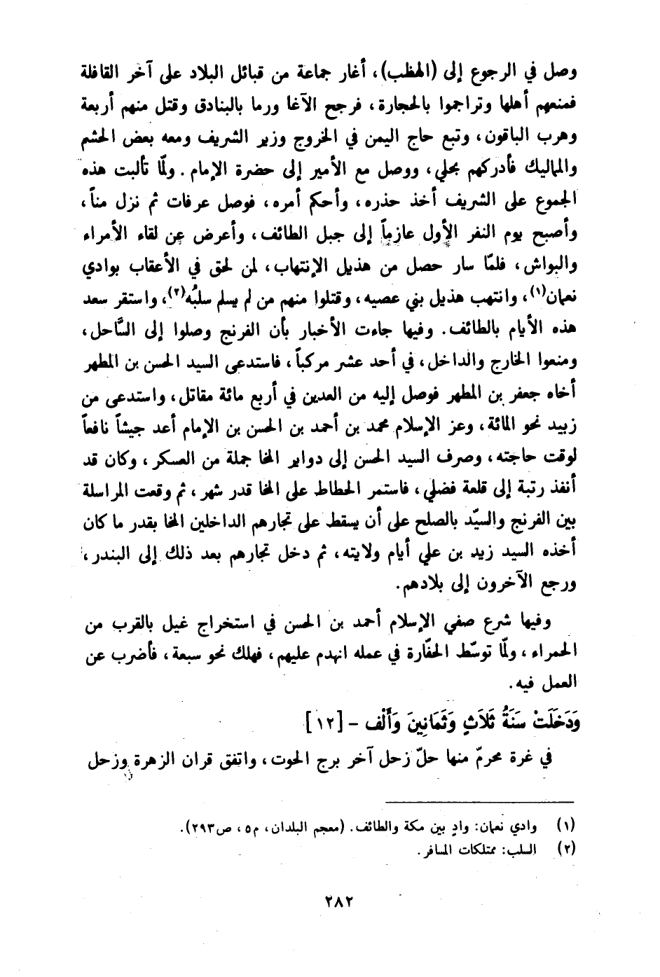 وَلما تألبت هَذِه الجموع على الشريف أَخذ حذره وَأحكم أمره فوصل عَرَفَات ثمَّ نزل منا وَأصْبح يَوْم النَّفر الأول عَازِمًا على جبل الطَّائِف وَأعْرض عَن لِقَاء الْأُمَرَاء والبواش فَلَمَّا سَار حصل من هُذَيْل الإنتهاب لمن لحق فِي الأعقاب بوادي نعْمَان وانتهب هُذَيْل بني عصيه وَقتلُوا مِنْهُم من لم يسلم سلبه وَاسْتقر سعد هَذِه الْأَيَّام بِالطَّائِف
