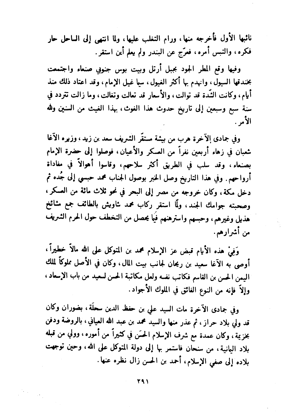 وَفِي هَذِه الْأَيَّام قبض عز الْإِسْلَام مُحَمَّد بن المتَوَكل على الله مَالا خطيرا أوصى بِهِ الآغا سعيد بن ريحَان لجَانب بَيت المَال وَكَانَ فِي الأَصْل مَمْلُوكا لملك الْيمن الْحسن بن الْقَاسِم فكاتب نَفسه وَلَعَلَّ مُكَاتبَة الْحسن لسَعِيد من بَاب الإسعاد وَإِلَّا فَإِنَّهُ من النَّوْع الْفَائِق فِي الْمُلُوك الأجواد