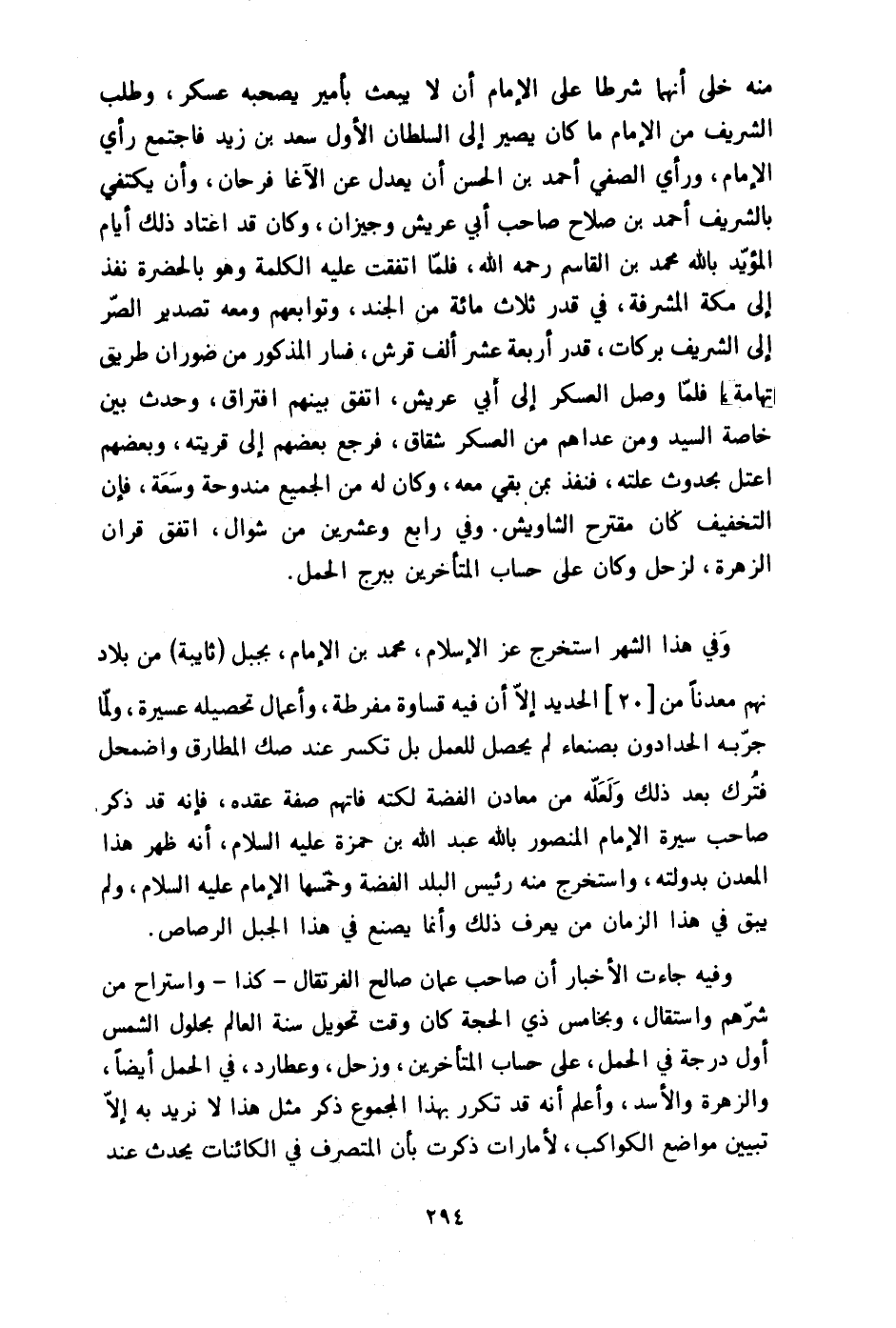 مِنْهُ خلى أَنَّهُمَا شرطا على الإِمَام أَن لَا يبْعَث بأمير يَصْحَبهُ عَسْكَر وَطلب االشريف من الإِمَام مَا كَانَ يصير إِلَى السُّلْطَان الأول سعد بن زيد فَاجْتمع رَأْي الإِمَام ورأي الصفي أَحْمد بن الْحسن أَن يعدل عَن الآغا فرحان وَأَن يَكْتَفِي بالشريف أَحْمد بن صَلَاح صَاحب أبي عَرِيش وجيزان وَكَانَ قد اعْتَادَ ذَلِك أَيَّام الْمُؤَيد بِاللَّه مُحَمَّد بن الْقَاسِم رَحمَه الله فَلَمَّا اتّفقت عَلَيْهِ الْكَلِمَة وَهُوَ بالحضرة نفذ إِلَى مَكَّة المشرفة فِي قدر ثَلَاث مائَة من الْجند وتوابعهم وَمَعَهُ تصدير الصر إِلَى الشريف بَرَكَات قدر أَرْبَعَة عشر ألف قِرْش فَسَار الْمَذْكُور من ضوران طَرِيق تهَامَة فَلَمَّا وصل الْعَسْكَر إِلَى أبي عَرِيش اتّفق بَينهم افْتِرَاق وَحدث بَين خَاصَّة السَّيِّد وَمن عداهم من الْعَسْكَر شقَاق فَرجع بَعضهم إِلَى قريته وَبَعْضهمْ اعتل بحدوث علته فنفذ بِمن بَقِي مَعَه وَكَانَ لَهُ من الْجَمِيع مندوحة وسعة فَإِن التَّخْفِيف كَانَ مقترح الشاويش وَفِي رَابِع وَعشْرين من شَوَّال اتّفق قرَان الزهرة لزحل وَكَانَ على حِسَاب الْمُتَأَخِّرين ببرج الْحمل