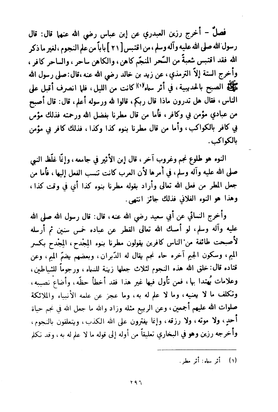 فصل أخرج رزين الْعَبدَرِي عَن إِبْنِ عَبَّاس رَضِي الله عَنْهُمَا قَالَ قَالَ رَسُول الله صلى الله عَلَيْهِ وَسلم من اقتبس بَابا من علم النُّجُوم لغير مَا ذكر الله فقد اقتبس شُعْبَة من السحر المنجم كَاهِن والكاهن سَاحر والساحر كَافِر وَأخرج السِّتَّة إِلَّا التِّرْمِذِيّ عَن زيد بن خَالِد رَضِي الله عَنهُ قَالَ صلى رَسُول الله صلى الله عَلَيْهِ وَسلم الصُّبْح بِالْحُدَيْبِية فِي أثر سَمَاء كَانَت من اللَّيْل فَلَمَّا انْصَرف أقبل على النَّاس فَقَالَ هَل تَدْرُونَ مَاذَا قَالَ ربكُم قَالُوا لله وَرَسُوله أعلم قَالَ قَالَ أصبح من عبَادي مُؤمن بِي كَافِر فَأَما من قَالَ مُطِرْنَا بِفضل الله وَرَحمته فَذَلِك مُؤمن بِي وَكَافِر بالكواكب وَأما من قَالَ مُطِرْنَا بِنَوْء كَذَا وَكَذَا فَذَلِك كَافِر بِي مُؤمن بالكواكب