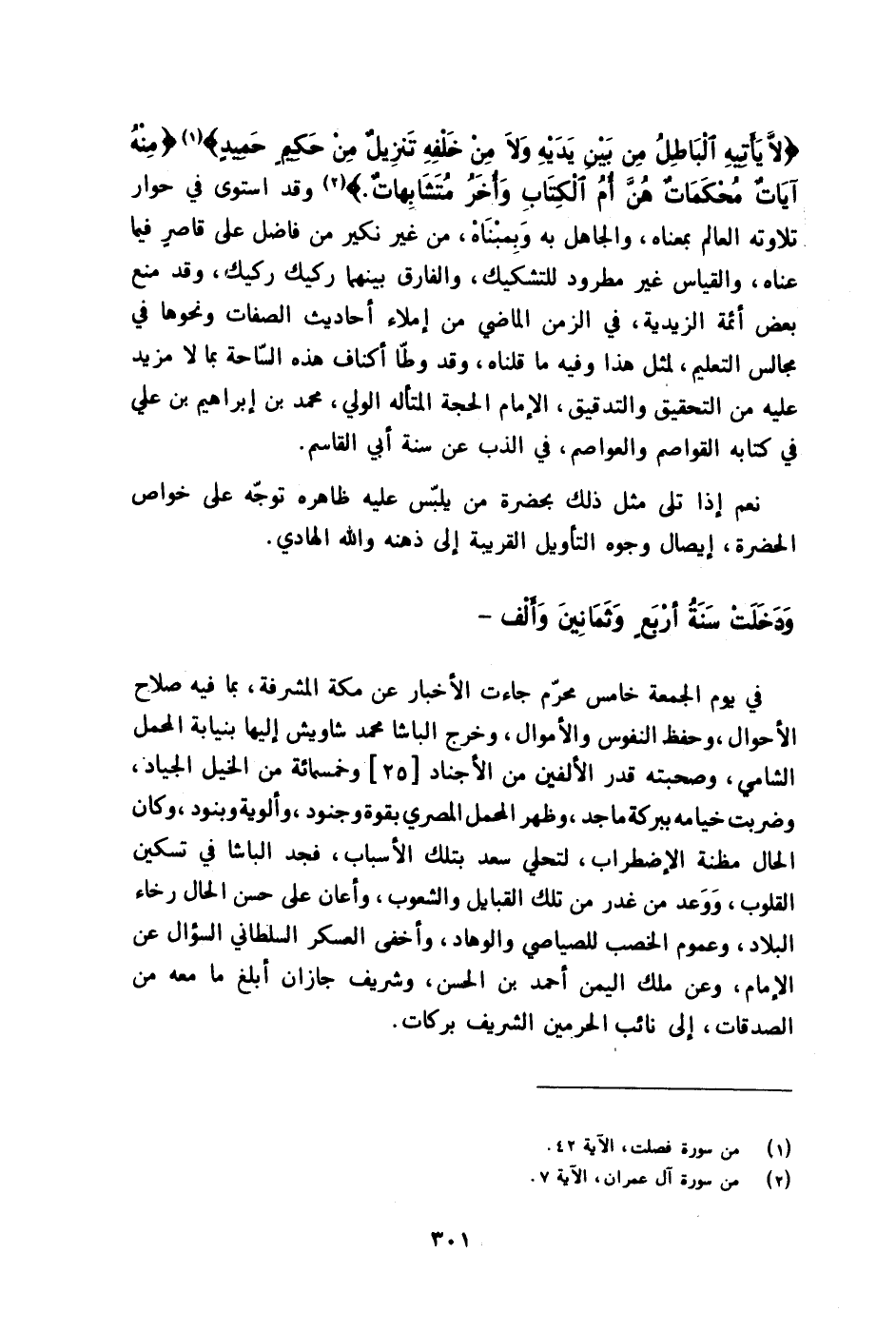 {لَا يَأْتِيهِ الْبَاطِل من بَين يَدَيْهِ وَلَا من خَلفه تَنْزِيل من حَكِيم حميد} {مِنْهُ آيَات محكمات هن أم الْكتاب وَأخر متشابهات} وَقد اسْتَوَى فِي حوار تِلَاوَته الْعَالم بِمَعْنَاهُ وَالْجَاهِل بِهِ وبمبناه من غير نَكِير من فَاضل على قَاصِر فِيمَا عناه وَالْقِيَاس غير مطرود للتشكيك والفارق بَينهمَا رَكِيك رَكِيك وَقد منع بعض أَئِمَّة الزيدية فِي الزَّمن الْمَاضِي من إملاء أَحَادِيث الصِّفَات وَنَحْوهَا فِي مجَالِس التَّعْلِيم لمثل هَذَا وَفِيه مَا قُلْنَاهُ وَقد وطا أكناف هَذِه الساحة بِمَا لَا مزِيد عَلَيْهِ من التَّحْقِيق والتدقيق الإِمَام الْحجَّة المتأله الْوَلِيّ مُحَمَّد بن إِبْرَاهِيم بن عَليّ فِي كِتَابه القواصم والعواصم فِي الذب عَن سنة أبي الْقَاسِم