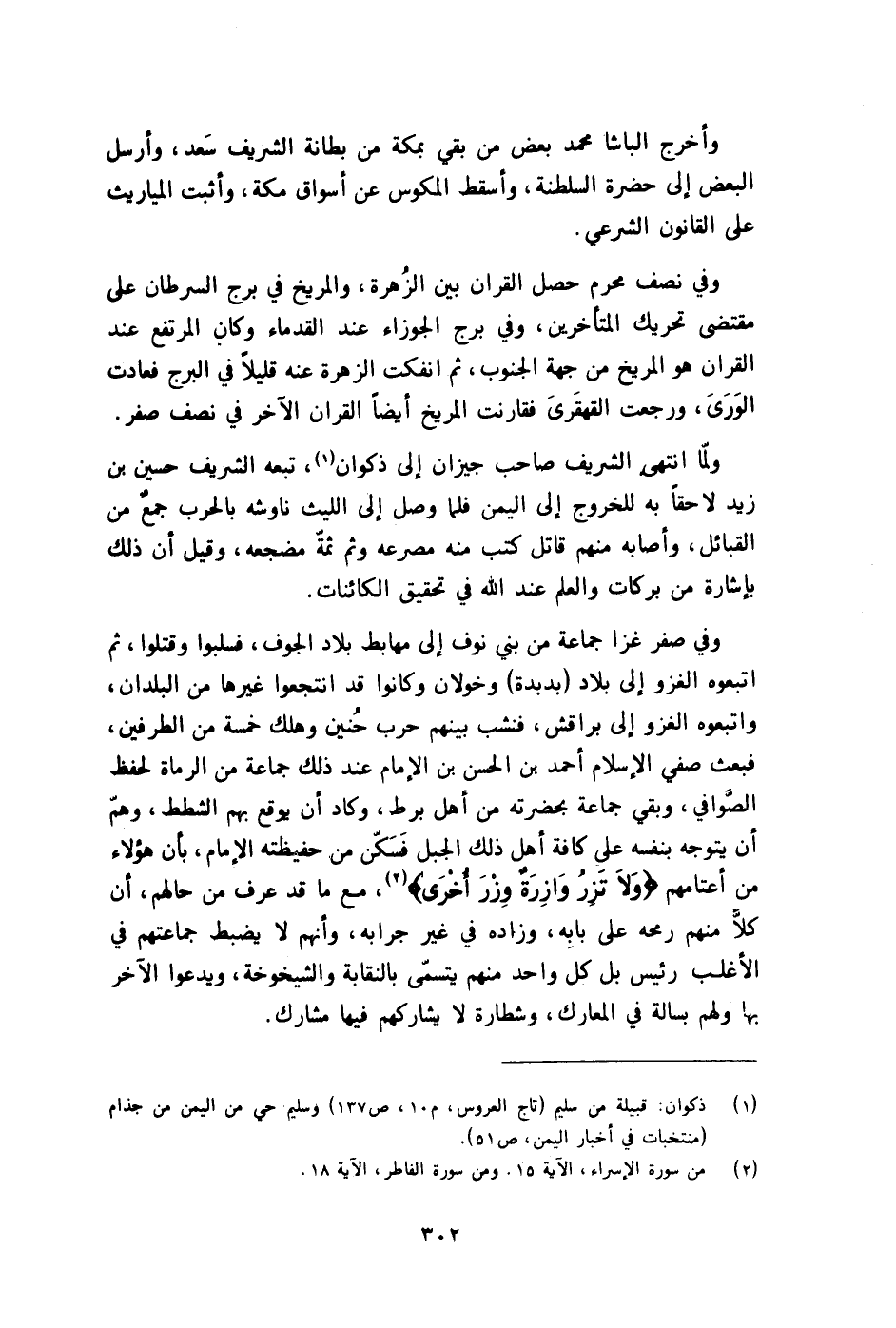 وَفِي صفر غزا جمَاعَة من بني نوف إِلَى مهابط بِلَاد الْجوف فسلبوا وَقتلُوا ثمَّ اتَّبعُوهُ الْغَزْو إِلَى بِلَاد بدبدة وخولان وَكَانُوا قد انتجعوا غَيرهَا من الْبلدَانِ واتبعوه الْغَزْو إِلَى براقش فنشب بَينهم حَرْب حنين وَهلك خَمْسَة من الطَّرفَيْنِ فَبعث صفي الْإِسْلَام أَحْمد بن الْحسن بن الإِمَام عِنْد ذَلِك جمَاعَة من الرُّمَاة لحفظ الصوافي وَبَقِي جمَاعَة بِحَضْرَتِهِ من أهل برط وَكَاد أَن يُوقع بهم الشطط وهم أَن يتَوَجَّه بِنَفسِهِ على كَافَّة أهل ذَلِك الْجَبَل فسكن من حفيظته الإِمَام بِأَن هَؤُلَاءِ من اعتامهم {وَلَا تزر وَازِرَة وزر أُخْرَى} مَعَ مَا قد عرف من حَالهم أَن كلا مِنْهُم رمحه على بَابه وزاده فِي غير جرابه وَأَنَّهُمْ لَا يضْبط جَمَاعَتهمْ فِي الْأَغْلَب رَئِيس بل كل وَاحِد مِنْهُم يتسمى بالنقابة والشيخوخة ويدعوا الآخر بهَا وَلَهُم بسالة فِي المعارك وشطارة لَا يشاركهم فِيهَا مشارك