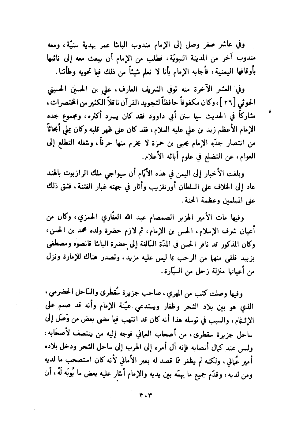 وفيهَا وصلت كتب من الْمهرِي صَاحب جَزِيرَة سقطرى والساحل الْحَضْرَمِيّ الَّذِي هُوَ بَين بِلَاد الشحر وظفار ويستدعي عينة الإِمَام وَأَنه قد صمم على الإئتمام وَالسَّبَب فِي توسله هَذَا أَنه كَانَ قد انتهب فِيمَا مضى بعض من وصل إِلَى سَاحل جَزِيرَة سقطرى من أَصْحَاب الْعمانِي فَوجه إِلَيْهِ من ينتصف لأَصْحَابه وَلَيْسَ عِنْد كَمَال أنصابه فَإِنَّهُ آل أمره إِلَى الْهَرَب إِلَى سَاحل الشحر وَدخل بِلَاده أَمِير عماني وَلكنه لم يظفر مِمَّا قصد لَهُ بِغَيْر الْأَمَانِي لِأَنَّهُ كَانَ استصحب مَا لَدَيْهِ وَمن لَدَيْهِ وَقدم جَمِيع مَا يهمه بَين يَدَيْهِ وَالْإِمَام أَشَارَ عَلَيْهِ بعض مِمَّا يوبه لَهُ أَن