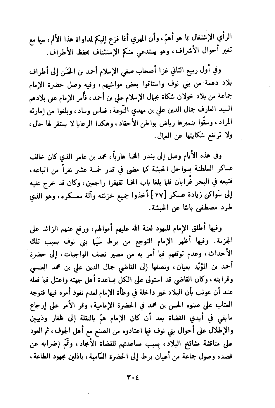 وفيهَا أطلق الإِمَام للْيَهُود لعنة الله عَلَيْهِم أَمْوَالهم وَرفع عَنْهُم الزَّائِد على الْجِزْيَة وفيهَا أظهر الإِمَام التوجع من برط سِيمَا بني نوف بِسَبَب تِلْكَ الْأَحْدَاث وَعدم توقفهم فِيمَا أَمر بِهِ من مصير نصف الْوَاجِبَات إِلَى حَضْرَة أَحْمد بن الْمُؤَيد بعيان وَنِصْفهَا إِلَى القَاضِي جمال الدّين عَليّ بن مُحَمَّد الْعَنسِي وقرابته وَكَانَ القَاضِي قد استولى على الْكل بمساعدة أهل جِهَته واعتل فِيمَا فعله عِنْد أَن عوتب بِأَن الْبِلَاد غير دَاخِلَة فِي وَطْأَة االإمام لعدم نُفُوذ أمره فِيهَا فَتوجه العتاب على صنوه الْحسن بن مُحَمَّد فِي الحضرة الإمامية وقر الْأَمر على إرجاع مَا بَقِي فِي أَيدي الْقُضَاة بعد أَن كَانَ الإِمَام هم بالنقلة إِلَى ظفار وذيبين والإطلال على أَحْوَال بني نوف فِيمَا اعتادوه من الصنع مَعَ أهل الْجوف ثمَّ الْعود على مناقشة مشائخ الْبِلَاد بِسَبَب مساعدتهم للقضاة الأمجاد وَتمّ إضرابه عَن قَصده وُصُول جمَاعَة من أَعْيَان برط إِلَى الحضرة السامية باذلين مجهود الطَّاعَة