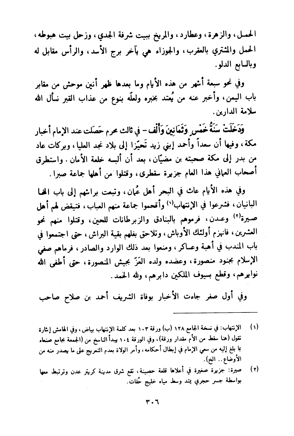 وَفِي هَذِه الْأَيَّام عاث فِي الْبَحْر أهل عمان وتبعت براشهم إِلَى بَاب المخا البانيان فشرعوا فِي الإنتهاب وأقحموا جمَاعَة مِنْهُم الْعباب فتيقض لَهُم أهل صيرة وعدن فَرَمَوْهُمْ بالبنادق والزبرطانات للحين وَقتلُوا مِنْهُم نَحْو الْعشْرين فَانْهَزَمَ أُولَئِكَ الأوباش وتلاحق بفلهم بَقِيَّة البراش حَتَّى اجْتَمعُوا فِي بَاب المندب فِي أهبة وعساكر وَمنعُوا بعد ذَلِك الْوَارِد والصادر فَرَمَاهُمْ صفي الْإِسْلَام بِجُنُود منصورة وعضده وَلَده الْعِزّ بِجَيْش المنصورة حَتَّى أطفى الله نوايرهم وَقطع بسيوف الْملكَيْنِ دابرهم وَللَّه الْحَمد