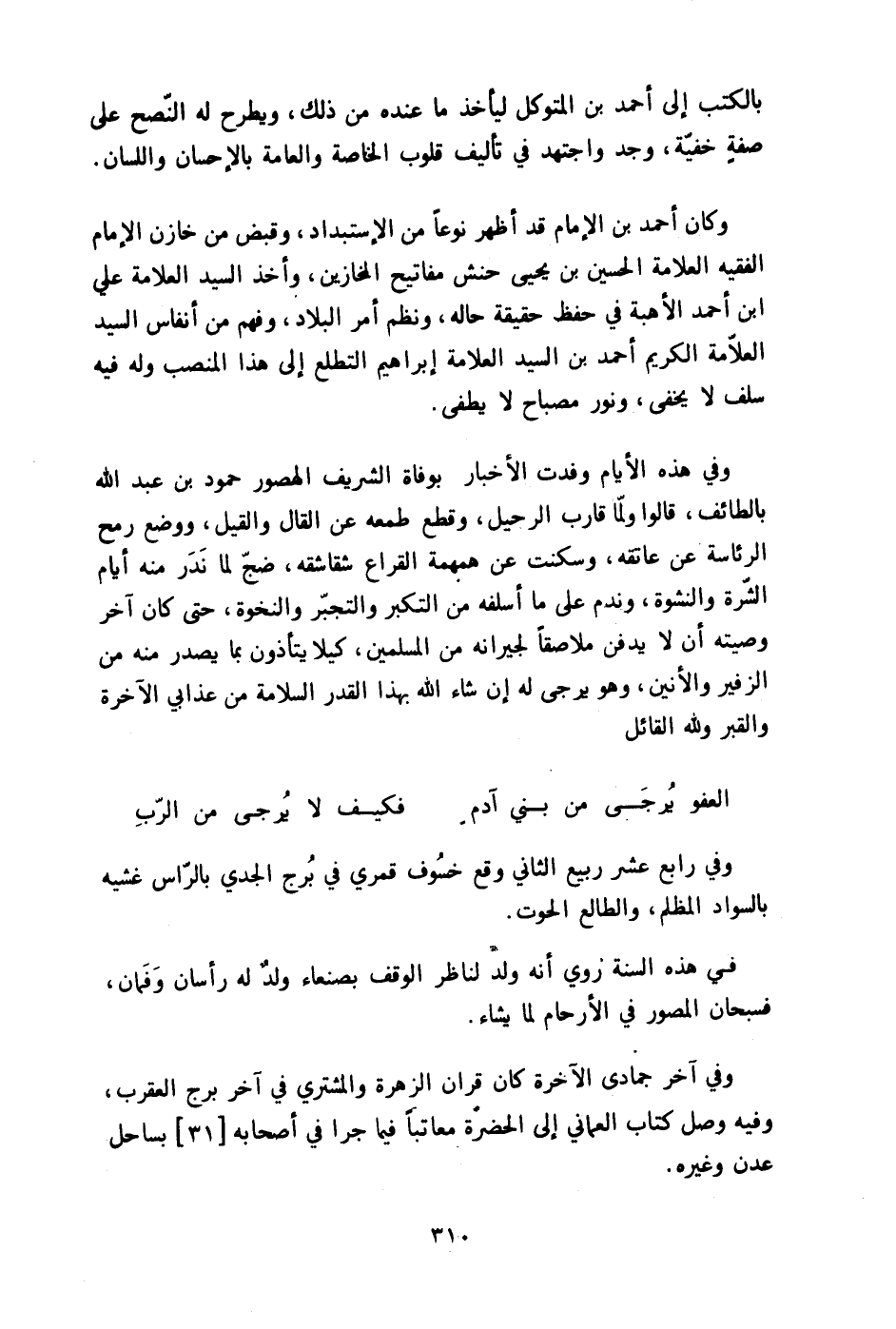وَفِي هَذِه الْأَيَّام وفدت الْأَخْبَار بوفاة الشريف الهصور حمود بن عبد الله بِالطَّائِف قَالُوا وَلما قَارب الرحيل وَقطع طمعه عَن القال والقيل وَوضع رمح الرِّئَاسَة عَن عَاتِقه وسكنت عَن همهمة القراع شقاشقه ضج لما ندر مِنْهُ أَيَّام الشرة والنشوة وَنَدم على مَا أسلفه من التكبر والتجبر والنخوة حَتَّى كَانَ آخر وَصيته ان لَا يدْفن ملاصقا لجيرانه من الْمُسلمين كَيْلا يتأذون بِمَا يصدر مِنْهُ من الزَّفِير والأنين وَهُوَ يُرْجَى لَهُ إِن شَاءَ الله بِهَذَا الْقدر السَّلامَة من عَذَابي الْآخِرَة والقبر وَللَّه الْقَائِل