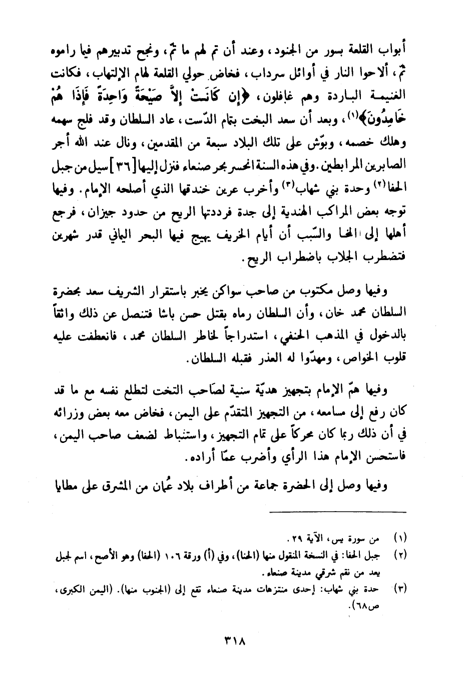 أَبْوَاب القلعة بسور من الْجنُود وَعند أَن تمّ لَهُم مَا تمّ ونجح تدبيرهم فِيمَا راموه ثمَّ ألاحوا النَّار فِي أَوَائِل سرداب فَخَاضَ حَولي القلعة لهام الإلتهاب فَكَانَت الْغَنِيمَة الْبَارِدَة وهم غافلون {إِن كَانَت إِلَّا صَيْحَة وَاحِدَة فَإِذا هم خامدون} وَبعد أَن سعد البخت بِتمَام الدست عَاد السُّلْطَان وَقد فلج سَهْمه وَهلك خَصمه وبوش على تِلْكَ الْبِلَاد سَبْعَة من المقدمين ونال عِنْد الله أجر الصابرين المرابطين وَفِي هَذِه السّنة انحسر بَحر صنعاء فَنزل إِلَيْهَا سيل من جبل الحفا وحدة بني شهَاب وأخرب عرين خندقها الَّذِي أصلحه الإِمَام وفيهَا توجه بعض المراكب الْهِنْدِيَّة إِلَى جدة فرددتها الرّيح من حُدُود جيزان فَرجع أَهلهَا إِلَى المخا وَالسَّبَب أَن أَيَّام الخريف يهيج فِيهَا الْبَحْر الْيَمَانِيّ قدر شَهْرَيْن فتضطرب الْجلاب باضطراب الرّيح