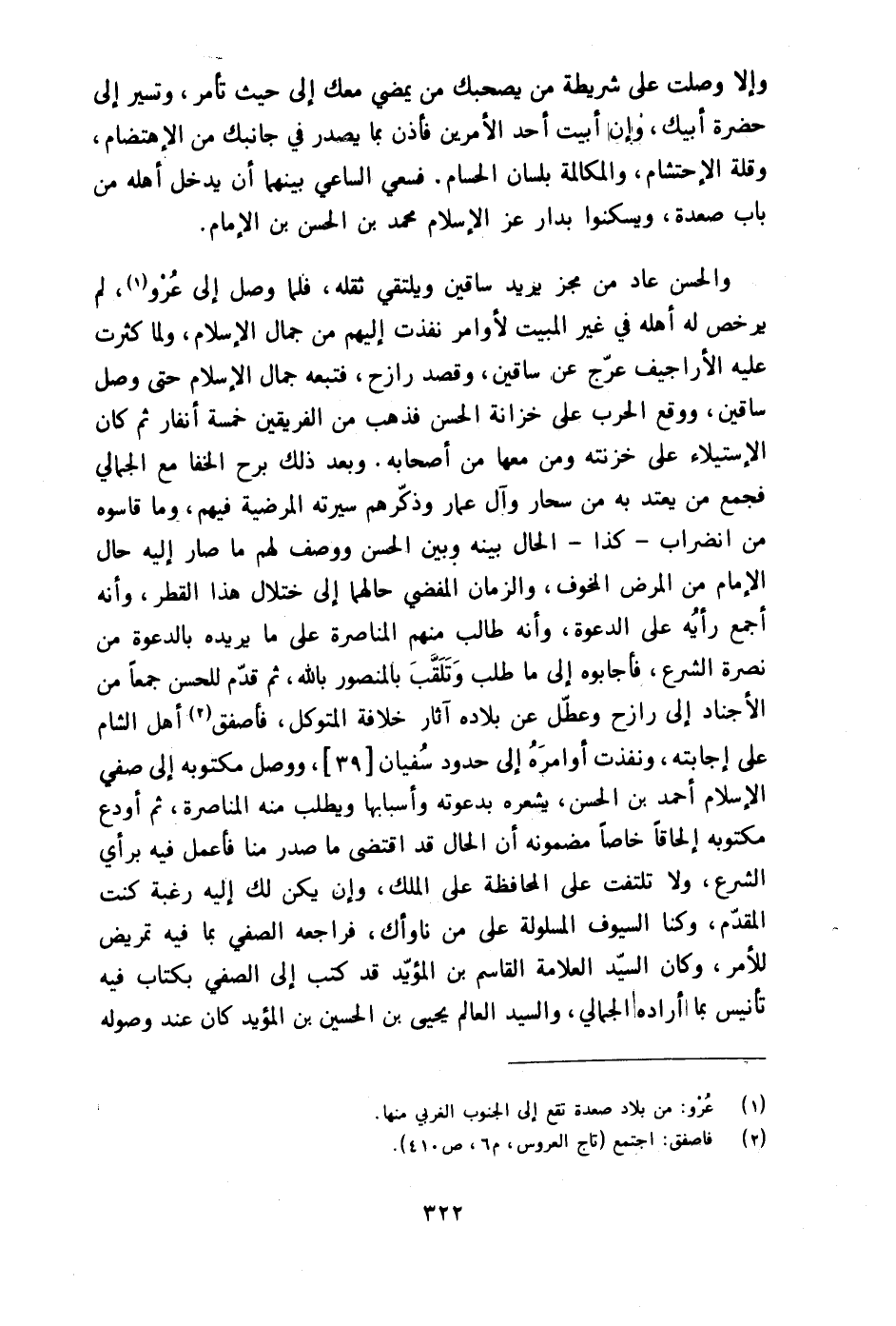 وَإِلَّا وصلت على شريطة من يصحبك من يمْضِي مَعَك إِلَى حَيْثُ تَأمر وتسير إِلَى حَضْرَة أَبِيك وَإِن أَبيت أحد الْأَمريْنِ فَأذن بِمَا يصدر فِي جَانِبك من الإهتضام وَقلة الإحتشام والمكالمة بِلِسَان الحسام فسعي السَّاعِي بَينهمَا أَن يدْخل أَهله من بَاب صعدة ويسكنوا بدار عز الْإِسْلَام مُحَمَّد بن الْحسن بن الإِمَام