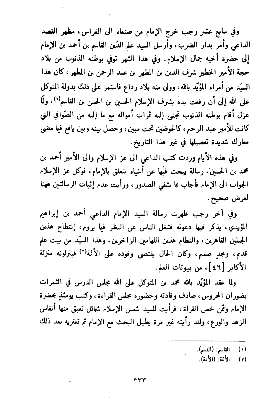 وَفِي آخر رَجَب ظَهرت رِسَالَة السَّيِّد الإِمَام الدَّاعِي أَحْمد بن إِبْرَاهِيم المؤيدي يذكر فِيهَا دَعوته فشغل النَّاس عَن النّظر فِيمَا يروم إنتطاح هذَيْن الجبلين القاهرين والتطام هذَيْن اللهامين الزاخرين وَهَذَا السَّيِّد من بَيت علم قديم ومجد صميم وَكَانَ الْحَال يقتضى وفوده على الْأَئِمَّة فينزلونه منزلَة الأكابر من بيوتات الْعلم