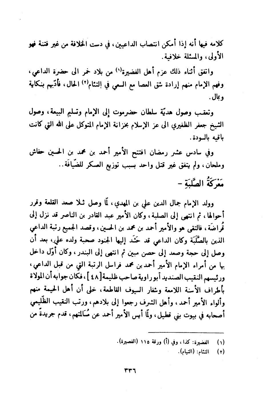 وَولد الإِمَام جمال الدّين عَليّ بن الْمهْدي لما وصل ثلا صعد القلعة وَقرر أحوالها ثمَّ انْتهى إِلَى الصلبة وَكَانَ الْأَمِير عبد الْقَادِر بن النَّاصِر قد نزل إِلَى قراضة فَالتقى هُوَ والأمير أَحْمد بن مُحَمَّد بن الْحُسَيْن وَقصد الْجَمِيع رُتْبَة الدَّاعِي الَّذين بالصلبة وَكَانَ الدَّاعِي قد حشد إِلَيْهَا الْجنُود صُحْبَة وَلَده عَليّ بعد أَن وصل إِلَى حجَّة وَصعد إِلَى حصن مُبين ثمَّ انْتهى إِلَى البندر وَكَانَ أول دَاخل بهَا من أُمَرَاء الإِمَام الْأَمِير احْمَد بن مُحَمَّد فراسل الرُّتْبَة الَّتِي من قبل الدَّاعِي وَرَئِيسهمْ النَّقِيب الصنديد أَبُو راوية وَصَاحب ظليمة فَكَانَ جَوَابه أَن المولاة بأطراف الأسنة اللامعة وشفار السيوف القاطعة خلى أَن أهل الحيمة مِنْهُم وألواء الْأَمِير احْمَد وَأهل الشّرف رجعُوا إِلَى بِلَادهمْ ورتب النَّقِيب الظليمي أَصْحَابه فِي بيُوت بني قطيل وَلما أيس الْأَمِير أَحْمد عَن مسالمتهم قدم جَرِيدَة من