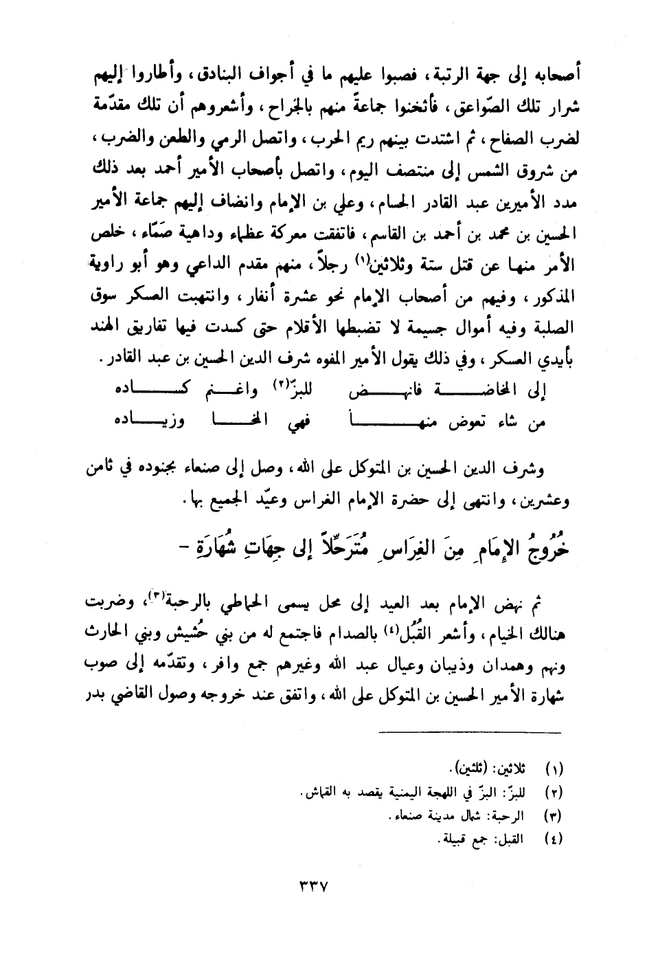 ثمَّ نَهَضَ الإِمَام بعد الْعِيد إِلَى مَحل يُسمى الحماطي بالرحبة وَضربت هُنَالك الْخيام وأشعر الْقبل بالصدام فَاجْتمع لَهُ من بني حشيش وَبني الْحَارِث ونهم وهمدان وذيبان وعيال عبد الله وَغَيرهم جمع وافر وتقدمه إِلَى صوب شهارة الْأَمِير الْحُسَيْن بن المتَوَكل على الله وَاتفقَ عِنْد خُرُوجه وُصُول القَاضِي بدر