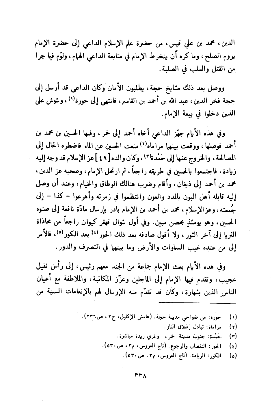 وَوصل بعد ذَلِك مَشَايِخ حجَّة يطْلبُونَ الْأمان وَكَانَ الدَّاعِي قد أرسل إِلَى حجَّة فَخر الدّين عبد الله بن أَحْمد بن الْقَاسِم فَانْتهى إِلَى حورة وشوش على الَّذين دخلُوا فِي بيعَة الإِمَام