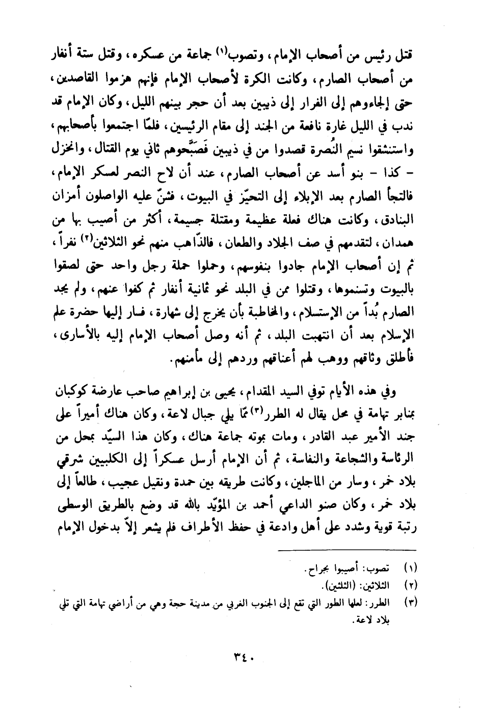 وَفِي هَذِه الْأَيَّام توفّي السَّيِّد الْمِقْدَام يحيى بن إِبْرَاهِيم صَاحب عارضة كوكبان بمنابر تهَامَة فِي مَحل يُقَال لَهُ الطرر مِمَّا يَلِي جبال لاعة وَكَانَ هُنَاكَ أَمِيرا على جند الْأَمِير عبد الْقَادِر وَمَات بِمَوْتِهِ جمَاعَة هُنَاكَ وَكَانَ هَذَا السَّيِّد بِمحل من الرِّئَاسَة والشجاعة والنفاسة ثمَّ أَن الإِمَام أرسل عسكرا إِلَى الكلبيين شَرْقي بِلَاد خمر وَكَانَ من الماجلين وَكَانَت طَريقَة بَين حمدة ونقيل عَجِيب طالعا إِلَى بِلَاد خمر وَكَانَ صنو الدَّاعِي أَحْمد بن الْمُؤَيد بِاللَّه قد وضع بِالطَّرِيقِ الْوُسْطَى رُتْبَة قَوِيَّة وشدد على أهل وَادعَة فِي حفظ الْأَطْرَاف فَلم يشْعر إِلَّا بِدُخُول الإِمَام