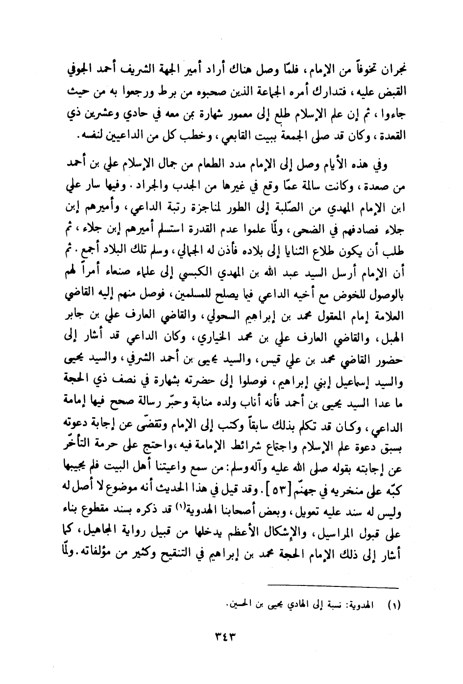 وَفِي هَذِه االأيام وصل إِلَى الإِمَام مدد الطَّعَام من جمال الْإِسْلَام عَليّ بن أَحْمد من صعدة وَكَانَت سَالِمَة عَمَّا وَقع فِي غَيرهَا من االجدب وَالْجَرَاد وفيهَا سَار عَليّ ابْن الإِمَام الْمهْدي من الصلبة إِلَى الطّور لمناجزة رُتْبَة الدَّاعِي وأميرهم ابْن جلاء فصادفهم فِي الضُّحَى وَلما علمُوا عدم الْقُدْرَة استسلم أَمِيرهمْ ابْن جلاء ثمَّ طلب أَن يكون طلاع الثنايا إِلَى بِلَاده فَأذن لَهُ الجمالي وَسلم تِلْكَ الْبِلَاد أجمع ثمَّ أَن الإِمَام أرسل السَّيِّد عبد الله بن الْمهْدي الكبسي إِلَى عُلَمَاء صنعاء أمرا لَهُم بالوصول للخوض مَعَ أَخِيه الدَّاعِي فِيمَا يصلح للْمُسلمين فوصل مِنْهُم إِلَيْهِ القَاضِي الْعَلامَة إِمَام الْمَعْقُول مُحَمَّد بن إِبْرَاهِيم السحولي وَالْقَاضِي الْعَارِف عَليّ بن جَابر الهبل وَالْقَاضِي الْعَارِف عَليّ بن مُحَمَّد الخياري وَكَانَ الدَّاعِي قد أَشَارَ إِلَى حُضُور القَاضِي مُحَمَّد بن عَليّ قيس وَالسَّيِّد يحيى بن أَحْمد الشرفي وَالسَّيِّد يحيى وَالسَّيِّد إِسْمَاعِيل إبني إِبْرَاهِيم فوصلوا إِلَى حَضرته بشهارة فِي نصف ذِي الْحجَّة مَا عدا السَّيِّد يحيى بن أَحْمد فَأَنَّهُ أناب وَلَده منابة وَحبر رِسَالَة صحّح فِيهَا إِمَامَة الدَّاعِي وَكَانَ قد تكلم بذلك سَابِقًا وَكتب إِلَى الإِمَام وتقضى عَن إِجَابَة دَعوته بسبق دَعْوَة علم الْإِسْلَام واجتماع شَرَائِط الْإِمَامَة فِيهِ وَاحْتج على حُرْمَة التَّأَخُّر عَن إجَابَته بقوله صلى الله عَلَيْهِ وَسلم من سمع واعيتنا أهل الْبَيْت فَلم يجيبها كَبه على مَنْخرَيْهِ فِي جَهَنَّم وَقد قيل فِي هَذَا الحَدِيث أَنه مَوْضُوع لَا أصل لَهُ وَلَيْسَ لَهُ سَنَد عَلَيْهِ تعويل وَبَعض أَصَابَنَا الهدوية قد ذكره بِسَنَد مَقْطُوع بِنَاء على قبُول الْمَرَاسِيل والإشكال الْأَعْظَم يدخلهَا من قبيل رِوَايَة المجاهيل كَمَا أَشَارَ إِلَى ذَلِك الإِمَام الْحجَّة مُحَمَّد بن إِبْرَاهِيم فِي التَّنْقِيح وَكثير من مؤلفاته وَلما