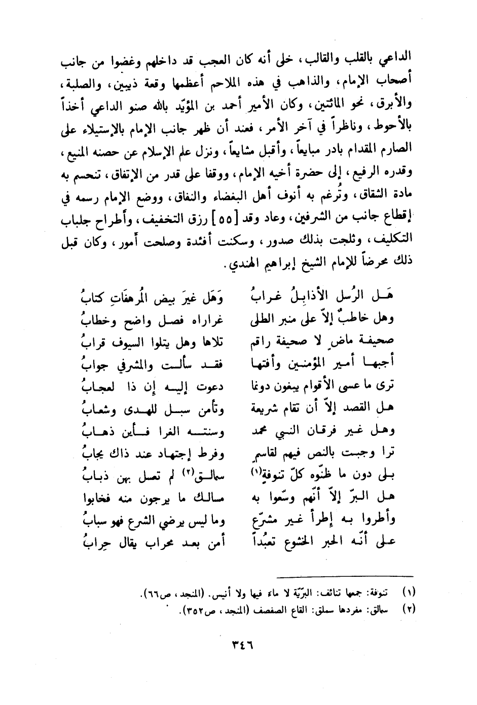 الدَّاعِي بِالْقَلْبِ والقالب خلى أَنه كَانَ الْعجب قد داخلهم وغضوا من جَانب أَصْحَاب الإِمَام والذاهب فِي هَذِه الملامم أعظمها وقْعَة ذيبين والصلبة والأبرق نَحْو الممائين وَكَانَ الْأَمِير أَحْمد بن الْمُؤَيد بِاللَّه صنو الدَّاعِي أخذا بالأحوط وناظرا فِي آخر الْأَمر فَعِنْدَ أَن ظهر جَانب الإِمَام بالإستيلاء على الصارم الْمِقْدَام بَادر مبايعا وَأَقْبل مشايعا وَنزل علم الْإِسْلَام عَن حصنه المنيع وَقدره الرفيع إِلَى حَضْرَة أَخِيه الإِمَام ووقفا على قدر من الإتفاق تنحسم بِهِ مَادَّة الشقاق وترغم بِهِ أنوف أهل الْبغضَاء والنفاق وَوضع االإمام رسمه فِي إقطاع جَانب من الشرفين وَعَاد وَقد رزق التَّخْفِيف وأطراح جِلْبَاب التَّكْلِيف وثلجت بذلك صُدُور وسكنت أَفْئِدَة وصلحت أُمُور وَكَانَ قبل ذَلِك محرضا للْإِمَام الشَّيْخ إبر اهيم الْهِنْدِيّ