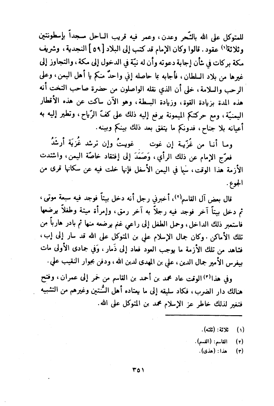 للمتوكل على الله بالشحر وعدن وَعمر فِيهِ قريب السَّاحِل مَسْجِدا بإسطونتين وَثَلَاثَة عُقُود قَالُوا وَكَانَ الإِمَام قد كتب إِلَى الْبِلَاد النجدية وشريف مَكَّة بَرَكَات فِي شَأْن إِجَابَة دَعوته وَأَن لَهُ نِيَّة فِي الدُّخُول إِلَى مَكَّة والتجاوز إِلَى غَيرهَا من بِلَاد السُّلْطَان فَأَجَابَهُ بِمَا حَاصله إِنِّي وَاحِد مِنْكُم يَا أهل الْيمن وعَلى الرحب والسلامة خلى أَن الَّذِي نَقله الواصلون من حَضْرَة صَاحب التخت أَنه هَذِه الْمدَّة بِزِيَادَة الْقُوَّة وَزِيَادَة البسطة وَهُوَ الْآن سَاكِت عَن هَذِه الأقطار اليمنية وَمَعَ حركتكم الميمونة يرفع إِلَيْهِ ذَلِك على كف الرِّيَاح وَتَطير إِلَيْهِ بِهِ أعيانه بِلَا جنَاح فدونكم مَا يتَّفق بعد ذَلِك بَيْنكُم وَبَينه