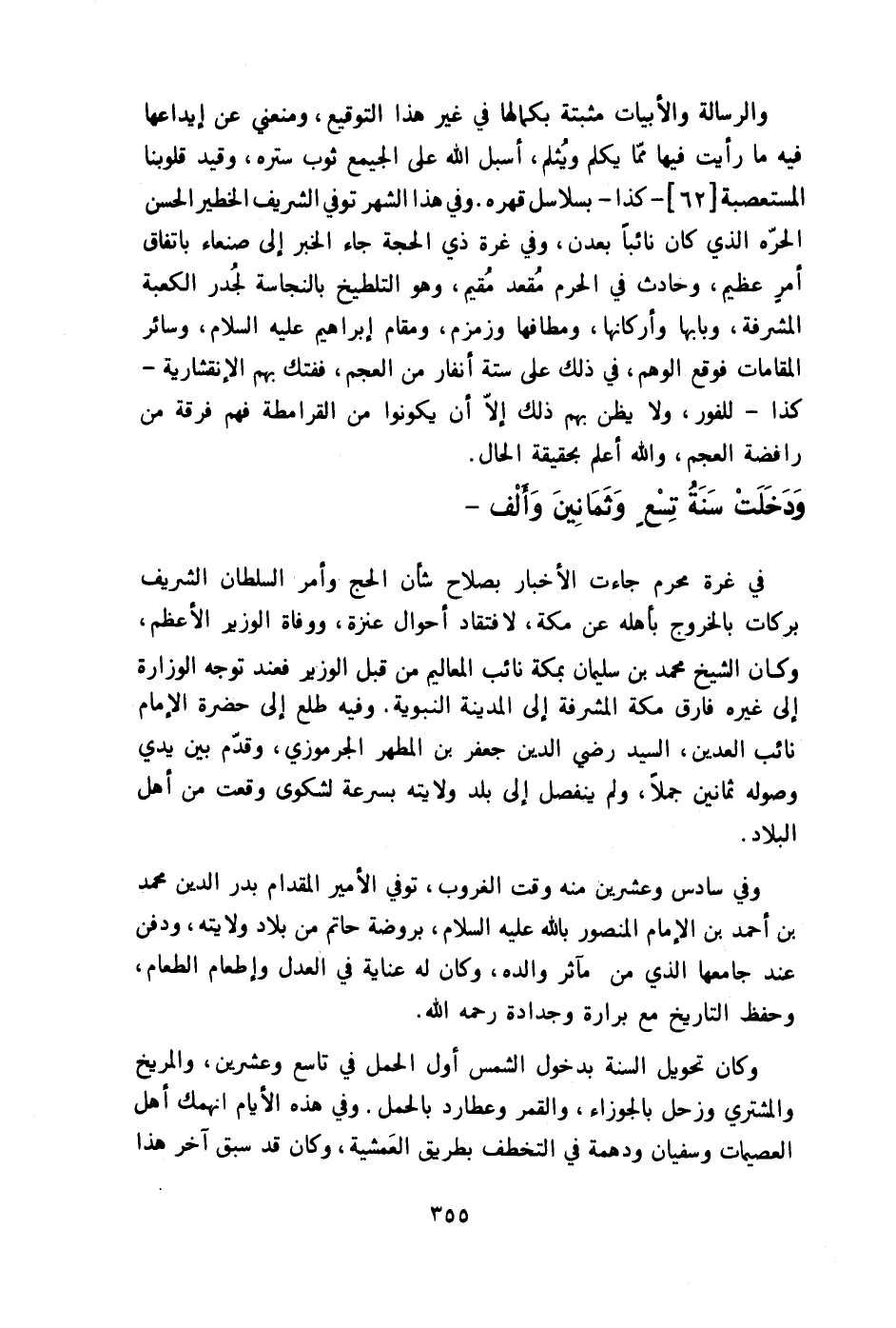 فِي غرَّة محرم جَاءَت الْأَخْبَار بصلاح شَأْن الْحَج وَأمر السُّلْطَان الشريف بَرَكَات بِالْخرُوجِ بأَهْله عَن مَكَّة لافتقاد أَحْوَال عنزة ووفاة الْوَزير الْأَعْظَم وَكَانَ الشَّيْخ مُحَمَّد بن سُلَيْمَان بِمَكَّة نَائِب المعاليم من قبل الْوَزير فَعِنْدَ توجه الوزارة إِلَى غَيره فَارق مَكَّة المشرفة إِلَى الْمَدِينَة النَّبَوِيَّة وَفِيه طلع إِلَى حَضْرَة الإِمَام نَائِب العدين السَّيِّد رَضِي الدّين جَعْفَر بن المطهر الجرموزي وَقدم بَين يَدي وُصُوله ثَمَانِينَ جملا وَلم ينْفَصل إِلَى بلد ولَايَته بِسُرْعَة لشكوى وَقعت من أهل الْبِلَاد