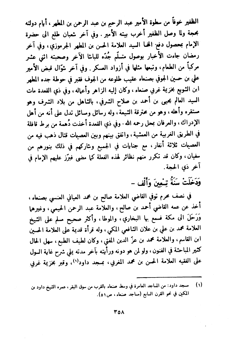 الظفير خوفًا من سطوة الْأَمِير عبد الرَّحِيم بن عبد الرَّحْمَن بن المطهر أَيَّام دولته بِحجَّة وَلما وصل الظفير أخرب بَيته الْأَمِير وفيآخر شعْبَان طلع الى حَضْرَة الإِمَام بمحصول دفع المخا السَّيِّد الْعَلامَة الْحسن بن المطهر الجرموزي وَفِي آخر رَمَضَان جَاءَت الْأَخْبَار بوصول متسلم جده للباشا الآخر وصحبته اثْنَي عشر مركبا من الطَّعَام وتبعها مثلهَا فِي أزواد الْعَسْكَر وَفِي آخر شَوَّال قبض الْأَمِير عَليّ بن حُسَيْن الجوفي بِصَنْعَاء عقيب طلوعه من الْجوف فقبر فِي حوطة جده المطهر ابْن الشويع بخزيمة غربي صنعاء وَكَانَ إِلَيْهِ الزَّاهِر وأعماله وَفِي ذِي الْقعدَة مَاتَ السَّيِّد الْعَالم يحيى بن أَحْمد بن صَلَاح الشرفي بالشاهل من بِلَاد الشّرف وَهُوَ مستقره وَأَهله وَهُوَ من محترقة الشِّيعَة وَله رسائل ومسائل تدل على أَنه من أهل الْإِدْرَاك والعرفان بِمحل رَحمَه الله وَفِي ذِي الْقعدَة أخذت دهمة من برط قافلة فِي الطَّرِيق الغربية من العمشية وَاتفقَ بَينهم وَبَين العصيمات قتال ذهب فِيهِ من العصيمات ثَلَاثَة أَنْفَار مَعَ جنايات فِي الْجَمِيع وشاركهم فِي ذَلِك بنورهم من سُفْيَان وَكَانَ قد تكَرر مِنْهُم نَظَائِر لهَذِهِ الفعلة كَمَا مضى فبرز عَلَيْهِم الإِمَام فِي آخر ذِي الْحجَّة.