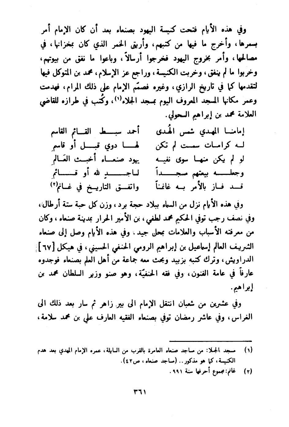 وَفِي هَذِه الْأَيَّام فتحت كَنِيسَة الْيَهُود بِصَنْعَاء بعد أَن كَانَ الإِمَام أَمر بسمرها وَأخرج مَا فِيهَا من كتبهمْ وأريق الْخمر الَّذِي كَانَ بمخزانها فِي مصالحها وَأمر بِخُرُوج الْيَهُود فَخَرجُوا أَرْسَالًا وَبَاعُوا مَا نفق من بُيُوتهم وخربوا مَا لم ينْفق وَخَربَتْ الْكَنِيسَة وراجع عز الْإِسْلَام مُحَمَّد بن المتَوَكل فِيهَا لتقدمها كَمَا فِي تَارِيخ الرَّازِيّ وَغَيره فصمم الإِمَام على ذَلِك المرام فهدمت وَعمر مَكَانهَا الْمَسْجِد الْمَعْرُوف الْيَوْم بِمَسْجِد الْجلاء وَكتب فِي طرازه للْقَاضِي الْعَلامَة مُحَمَّد بن إِبْرَاهِيم السحولي