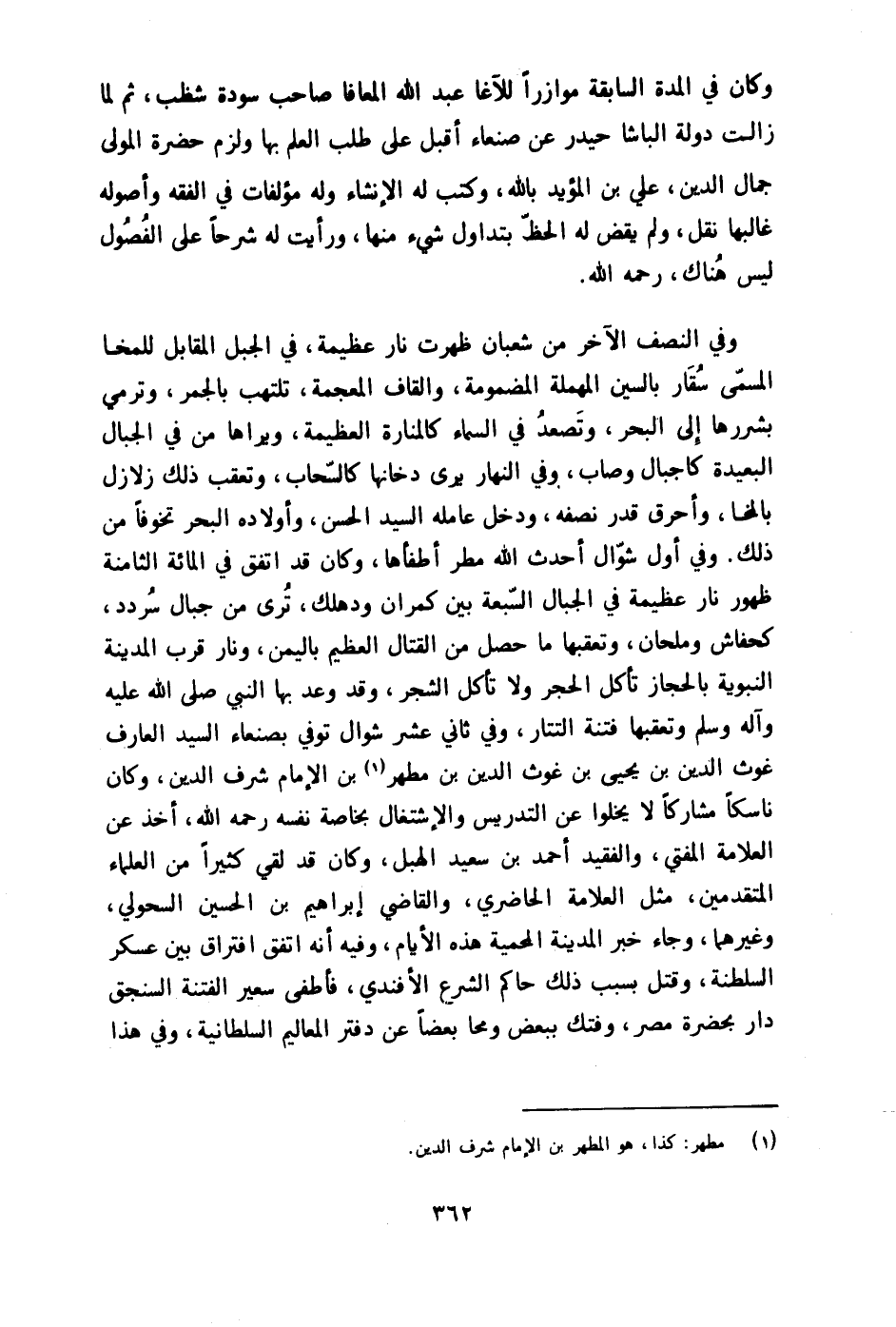 وَفِي النّصْف الآخر من شعْبَان ظَهرت نَار عَظِيمَة فِي الْجَبَل الْمُقَابل للمخا الْمُسَمّى سقار بِالسِّين الْمُهْملَة المضمومة وَالْقَاف الْمُعْجَمَة تلتهب بالجمر وَتَرْمِي بشررها إِلَى الْبَحْر وتصعد فِي السَّمَاء كالمنارة الْعَظِيمَة ويراها من فِي الْجبَال الْبَعِيدَة كاجبال وصاب وَفِي النَّهَار يرى دخانها كالسحاب وَتعقب ذَلِك زلازل بالمخا وأحرق قدر نصفه وَدخل عَامله السَّيِّد الْحسن وَأَوْلَاده الْبَحْر تخوفا من ذَلِك وَفِي أول شَوَّال أحدث الله مطر أطفأها وَكَانَ قد اتّفق فِي الْمِائَة الثَّامِنَة ظُهُور نَار عَظِيمَة فِي الْجبَال السَّبْعَة بَين كمران ودهلك ترى من جبل سردد كحفاش وملحان وتعقبها مَا حصل من الْقِتَال الْعَظِيم بِالْيمن ونار قرب الْمَدِينَة النَّبَوِيَّة بالحجاز تَأْكُل الْحجر وَلَا تَأْكُل الشّجر وَقد وعد بهَا النَّبِي صلى الله عَلَيْهِ وَسلم وتعقبها فتْنَة التتار وَفِي ثَانِي عشر شَوَّال توفّي بِصَنْعَاء السَّيِّد الْعَارِف غوث الدّين بن يحيى بن غوث الدّين بن مطهر بن الإِمَام شرف الدّين وَكَانَ ناسكا مشاركا لَا يخلوا عَن التدريس والإشتغال بِخَاصَّة نَفسه رَحمَه الله أَخذ عَن الْعَلامَة الْمُفْتِي والفقيد أَحْمد بن سعيد الهبل وَكَانَ قد لَقِي كثيرا من الْعلمَاء الْمُتَقَدِّمين مثل الْعَلامَة الحاضري وَالْقَاضِي إِبْرَاهِيم بن الْحُسَيْن السحولي وَغَيرهمَا وَجَاء خبر الْمَدِينَة المحمية هَذِه الْأَيَّام وَفِيه أَنه اتّفق افْتِرَاق بَين عَسْكَر السلطنة وَقتل بِسَبَب ذَلِك حَاكم الشَّرْع الأفندي فأطفى سعير الْفِتْنَة السنجق دَار بِحَضْرَة مصر وفتك بِبَعْض ومحا بَعْضًا عَن دفتر المعاليم السُّلْطَانِيَّة وَفِي هَذَا