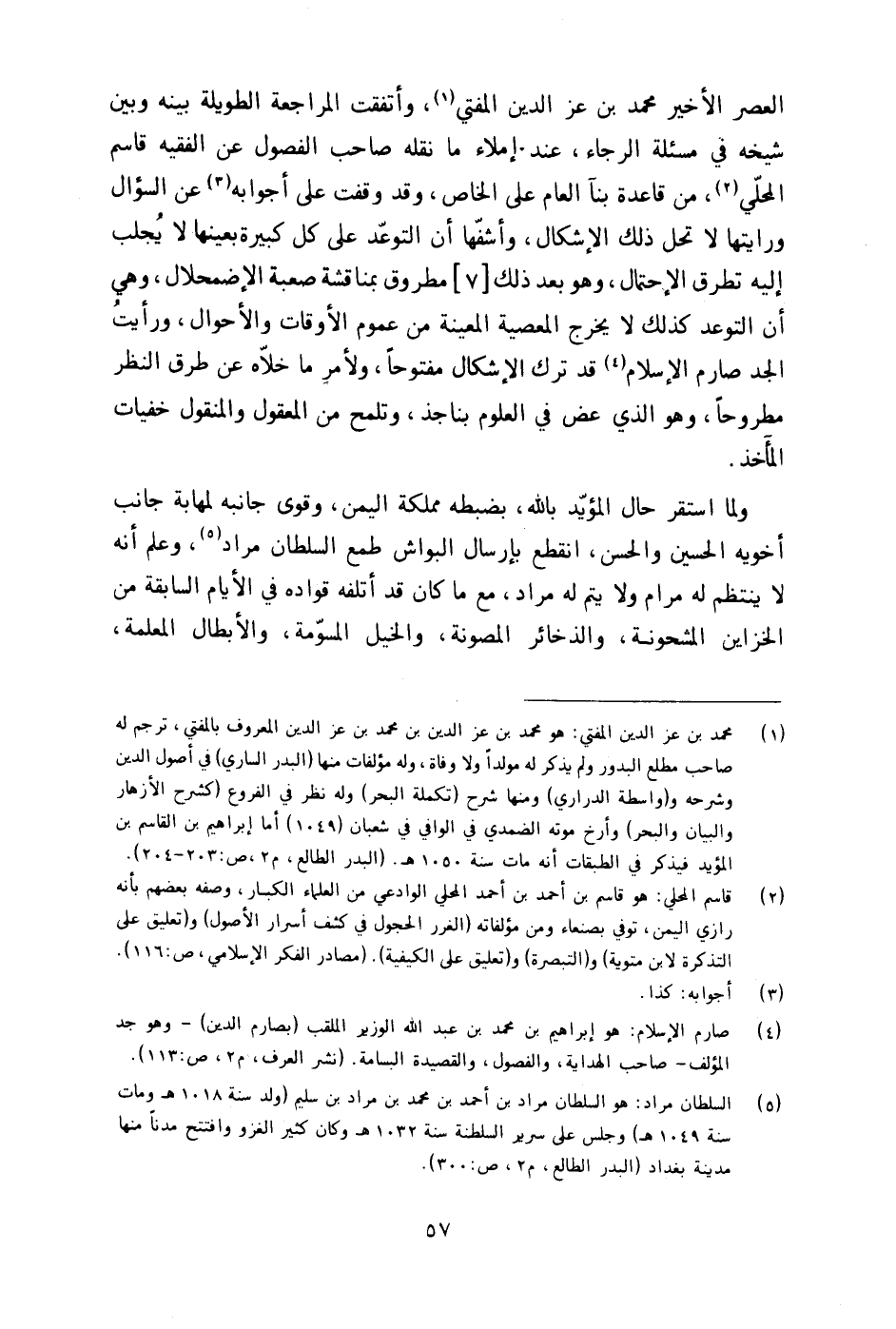 الْعَصْر الْأَخير مُحَمَّد بن عز الدّين الْمُفْتِي وأتفقت الْمُرَاجَعَة الطَّوِيلَة بَينه وَبَين شَيْخه فِي مسئلة الرَّجَاء عِنْد إملاء مَا نَقله صَاحب الْفُصُول عَن الْفَقِيه قَاسم الْمحلي من قَاعِدَة بنآ الْعَام على الْخَاص وَقد وقفت على أجوابه عَن السُّؤَال ورايتها لَا تحل ذَلِك الْإِشْكَال وأشفها أَن التوعد على كل كَبِيرَة بِعَينهَا لَا يجلب إِلَيْهِ تطرق الإحتمال وَهُوَ بعد ذَلِك مطروق بمناقشة صعبة الإضمحلال وَهِي أَن التوعد كَذَلِك لَا يخرج الْمعْصِيَة الْمعينَة من عُمُوم الْأَوْقَات وَالْأَحْوَال وَرَأَيْت الْجد صارم الْإِسْلَام قد ترك الْإِشْكَال مَفْتُوحًا ولأمر مَا خلاه عَن طرق النّظر مطروحا وَهُوَ الَّذِي عض فِي الْعُلُوم بناجذ وتلمح من الْمَعْقُول وَالْمَنْقُول خفيات المأخذ
