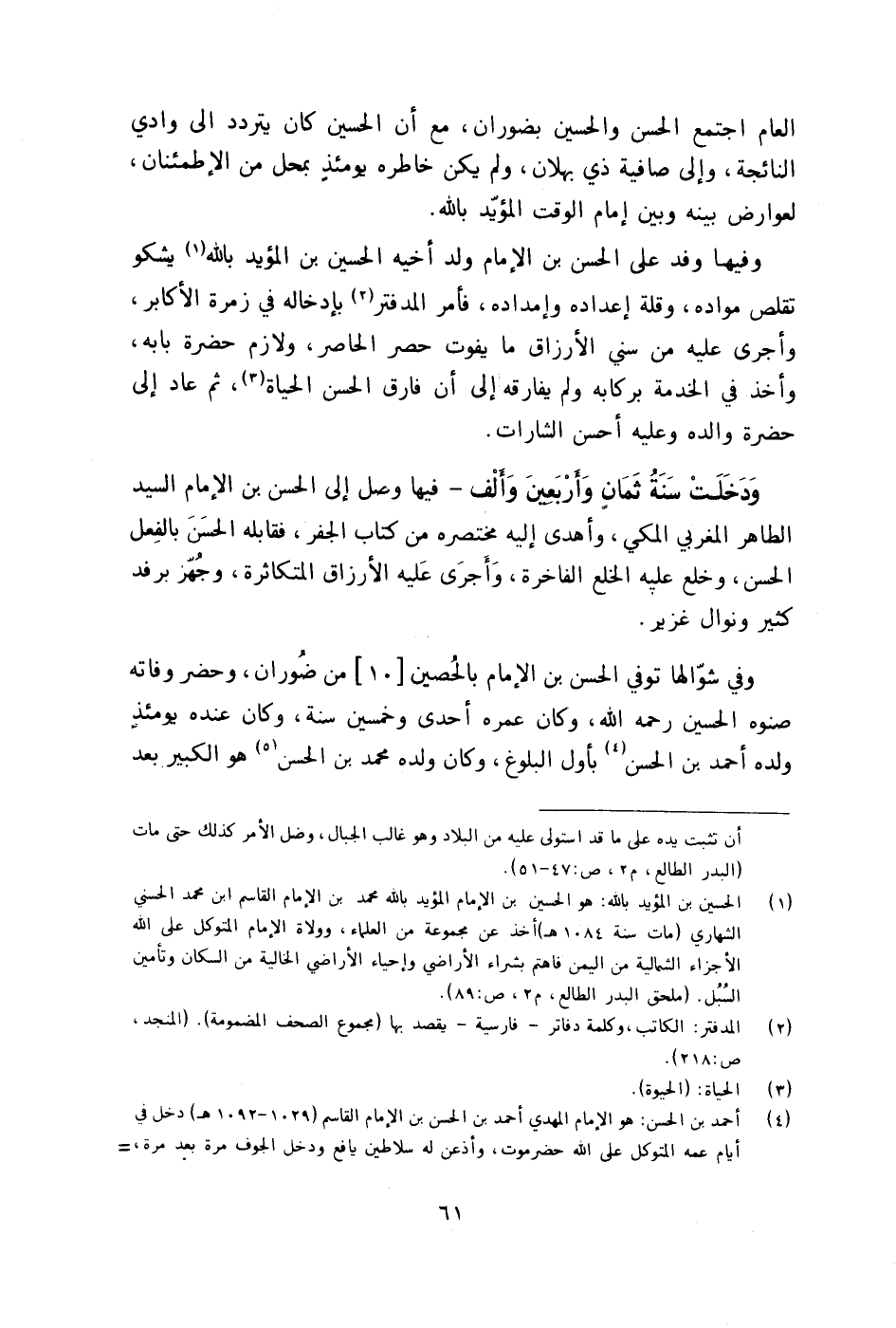 وفيهَا وَفد على الْحسن بن الإِمَام ولد أَخِيه الْحُسَيْن بن الْمُؤَيد بِاللَّه يشكو تقلص مواده وَقلة إعداده وإمداده فَأمر المدفتر بإدخاله فِي زمرة الأكابر وأجرى عَلَيْهِ من سني الأرزاق مَا يفوت حصر الحاصر ولازم حَضْرَة بَابه وَأخذ فِي الْخدمَة بركابه وَلم يُفَارِقهُ إِلَى أَن فَارق الْحسن الْحَيَاة ثمَّ عَاد إِلَى حَضْرَة وَالِده وَعَلِيهِ أحسن الشارات