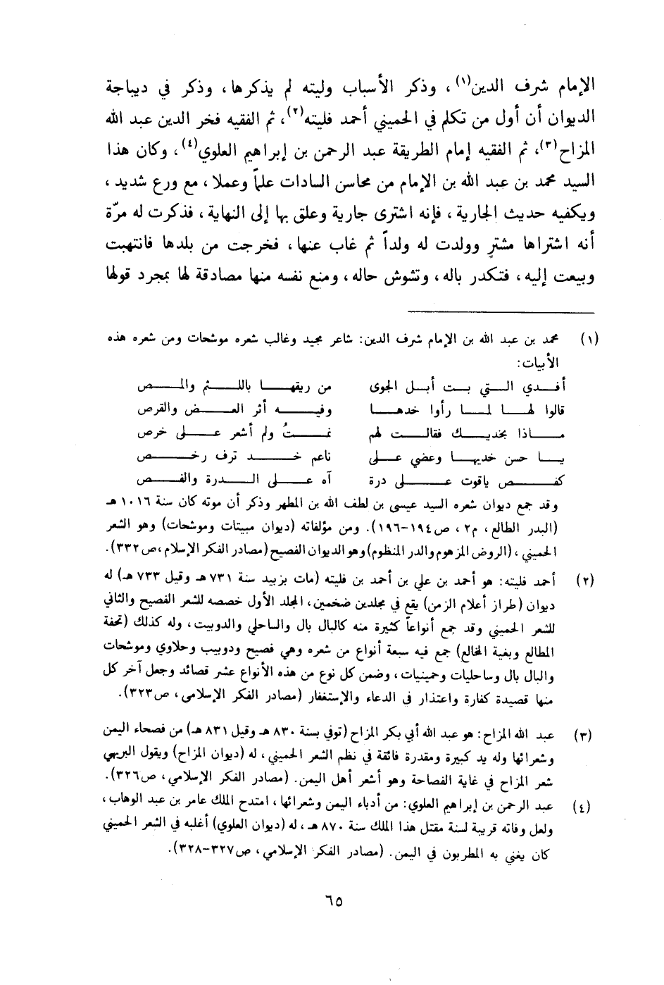 الإِمَام شرف الدّين وَذكر الْأَسْبَاب وليته لم يذكرهَا وَذكر فِي ديباجة الدِّيوَان أَن أول من تكلم فِي الحميني أَحْمد فليته ثمَّ الْفَقِيه فَخر الدّين عبد الله المزاح ثمَّ الْفَقِيه إِمَام الطَّرِيقَة عبد الرَّحْمَن بن إِبْرَاهِيم الْعلوِي وَكَانَ هَذَا السَّيِّد مُحَمَّد بن عبد الله بن الإِمَام من محَاسِن السادات علما وَعَملا مَعَ ورع شَدِيد ويكفيه حَدِيث الْجَارِيَة فَإِنَّهُ اشْترى جَارِيَة وعلق بهَا إِلَى النِّهَايَة فَذكرت لَهُ مرّة أَنه اشْتَرَاهَا مُشْتَر وَولدت لَهُ ولدا ثمَّ غَابَ عَنْهَا فَخرجت من بَلَدهَا فانتهبت وبيعت إِلَيْهِ فتكدر باله وتشوش حَاله وَمنع نَفسه مِنْهَا مصادقة لَهَا بِمُجَرَّد قَوْلهَا