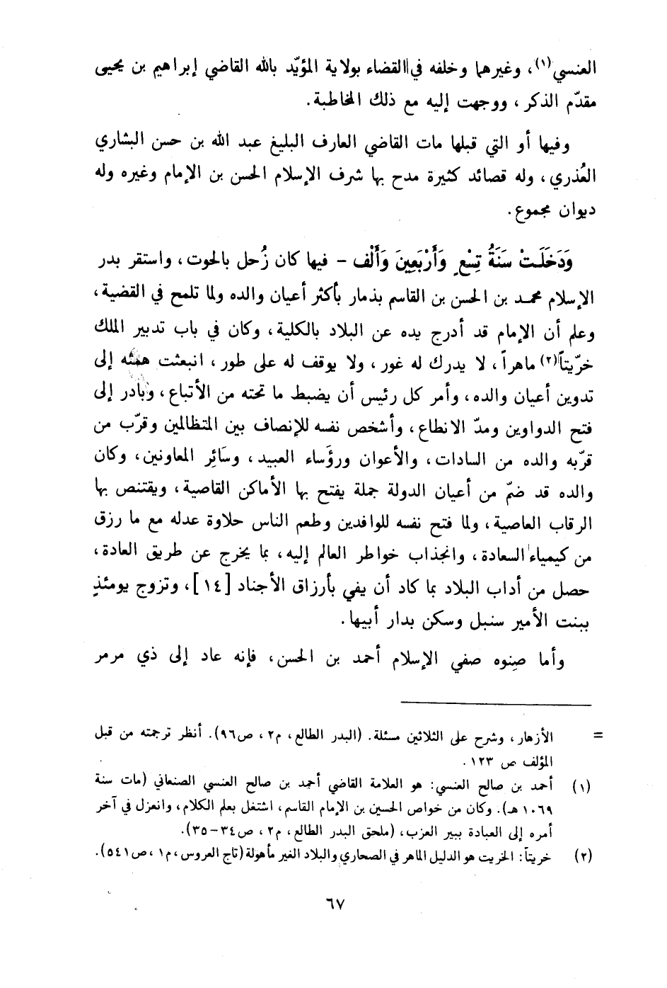 وفيهَا أَو الَّتِي قبلهَا مَاتَ القَاضِي الْعَارِف البليغ عبد الله بن حسن البشاري العذري وَله قصائد كَثِيرَة مدح بهَا شرف الْإِسْلَام الْحسن بن الإِمَام وَغَيره وَله ديوَان مَجْمُوع