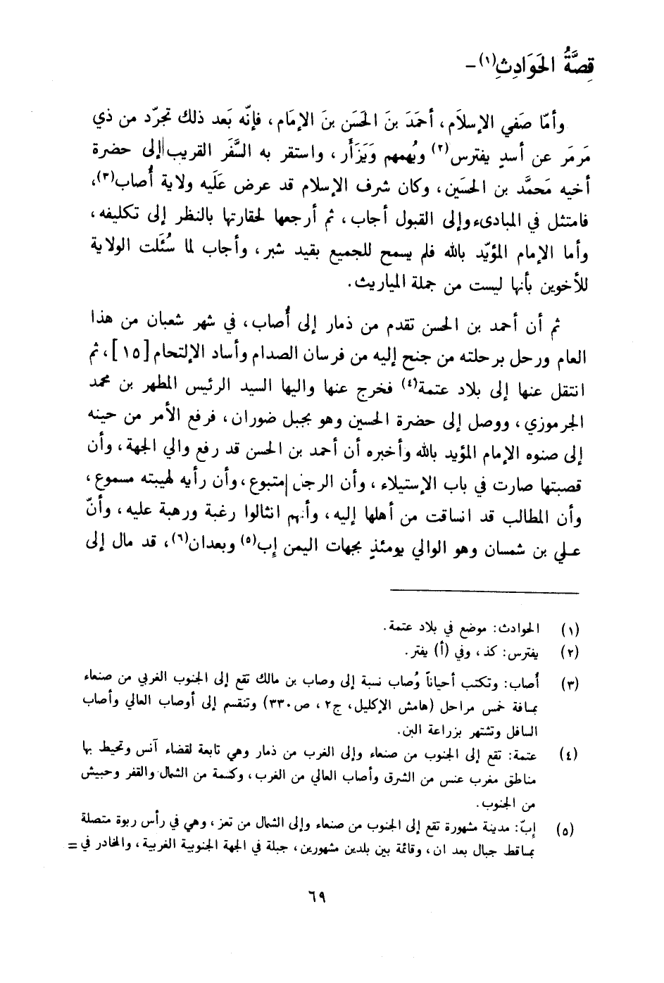 ثمَّ أَن أَحْمد بن الْحسن تقدم من ذمار إِلَى أصَاب فِي شهر شعْبَان من هَذَا الْعَام ورحل برحلته من جنح إِلَيْهِ من فرسَان الصدام وأساد الإلتحام ثمَّ انْتقل عَنْهَا إِلَى بِلَاد عتمة فَخرج عَنْهَا واليها السَّيِّد الرئيس المطهر بن مُحَمَّد الجرموزي وَوصل إِلَى حَضْرَة الْحُسَيْن وَهُوَ بجبل ضوران فَرفع الْأَمر من حِينه إِلَى صنوه الإِمَام الْمُؤَيد بِاللَّه وَأخْبرهُ أَن أَحْمد بن الْحسن قد رفع وَالِي الْجِهَة وَأَن قصبتها صَارَت فِي بَاب الإستيلاء وَأَن الرجل متبوع وَأَن رأية لهيبته مسموع وَأَن المطالب قد انساقت من أَهلهَا إِلَيْهِ وَأَنَّهُمْ انثالوا رَغْبَة وَرَهْبَة عَلَيْهِ وَأَن عَليّ بن شمسان وَهُوَ الْوَالِي يَوْمئِذٍ بجهات الْيمن إب وبعدان قد مَال إِلَى