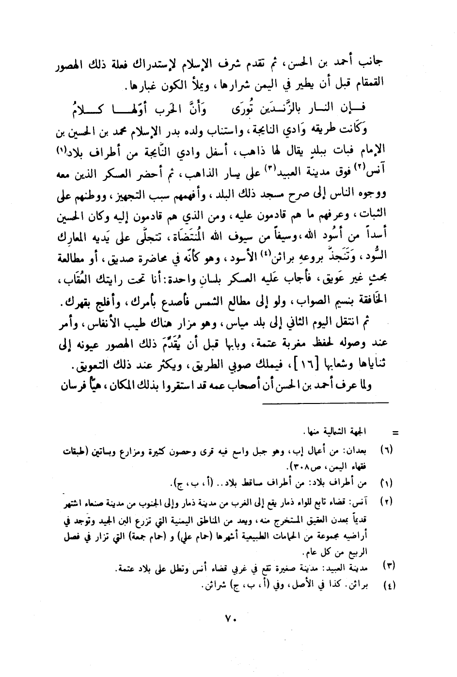 جَانب أَحْمد بن الْحسن ثمَّ تقدم شرف الْإِسْلَام لإستدراك فعلة ذَلِك الهصور القمقام قبل أَن يطير فِي الْيمن شِرَارهَا ويملأ الْكَوْن غبارها
