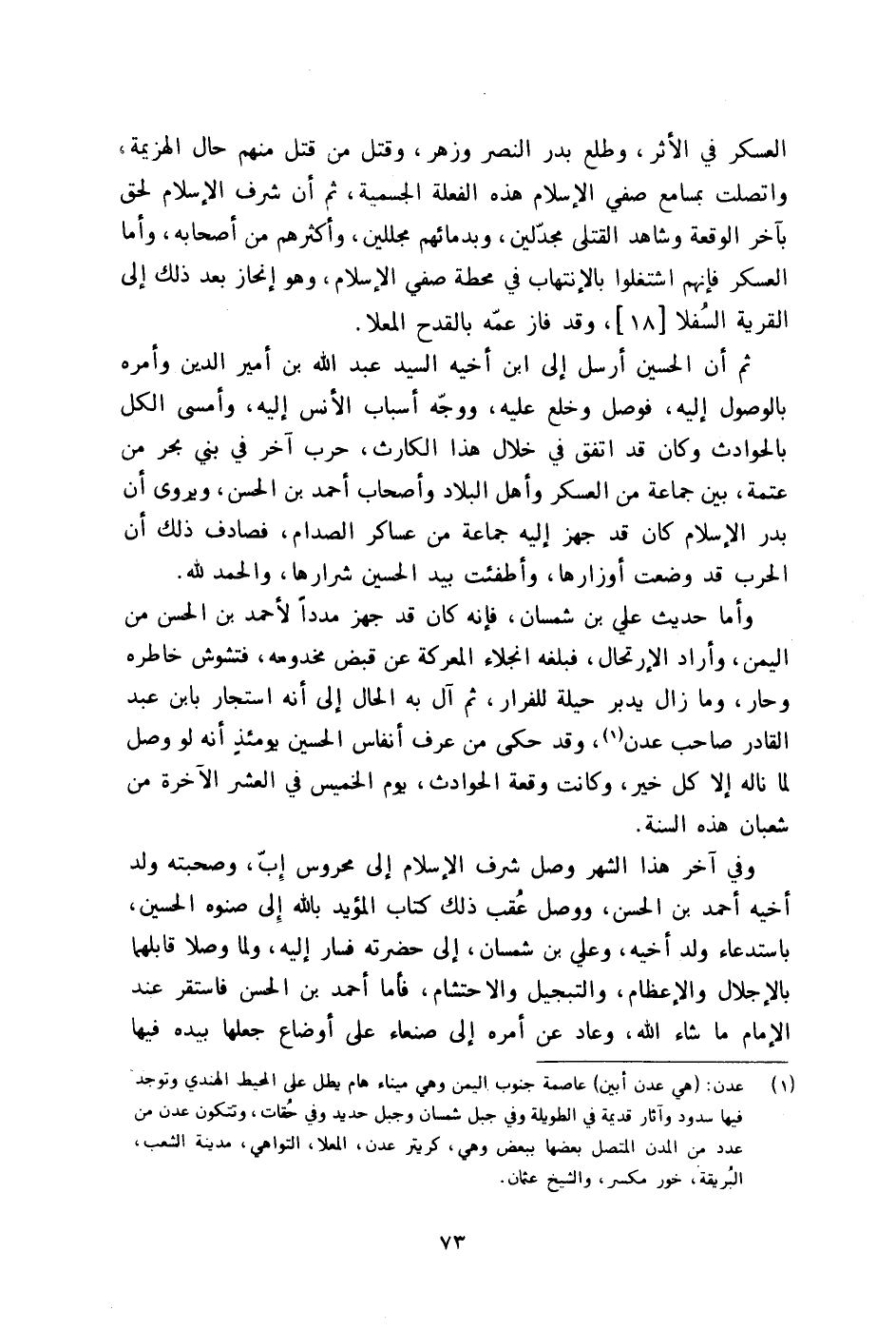 ثمَّ أَن الْحُسَيْن أرسل إِلَى ابْن أَخِيه السَّيِّد عبد الله بن أَمِير الدّين وَأمره بالوصول إِلَيْهِ فوصل وخلع عَلَيْهِ وَوجه أَسبَاب الْأنس إِلَيْهِ وَأمسى الْكل بالحوادث وَكَانَ قد اتّفق فِي خلال هَذَا الكارث حَرْب آخر فِي بني بَحر من عتمة بَين جمَاعَة من الْعَسْكَر وَأهل الْبِلَاد وَأَصْحَاب أَحْمد بن الْحسن ويروى أَن بدر الْإِسْلَام كَانَ قد جهز إِلَيْهِ جمَاعَة من عَسَاكِر الصدام فصادف ذَلِك أَن الْحَرْب قد وضعت أَوزَارهَا وأطفئت بيد الْحُسَيْن شِرَارهَا وَالْحَمْد لله