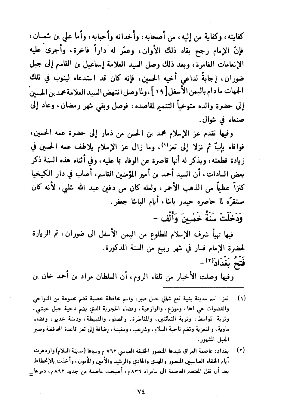 فِيهَا تهَيَّأ شرف الْإِسْلَام للطلوع من الْيمن الْأَسْفَل الى ضوران ثمَّ الزِّيَارَة لحضرة الإِمَام فَسَار فِي شهر ربيع من السّنة الْمَذْكُورَة