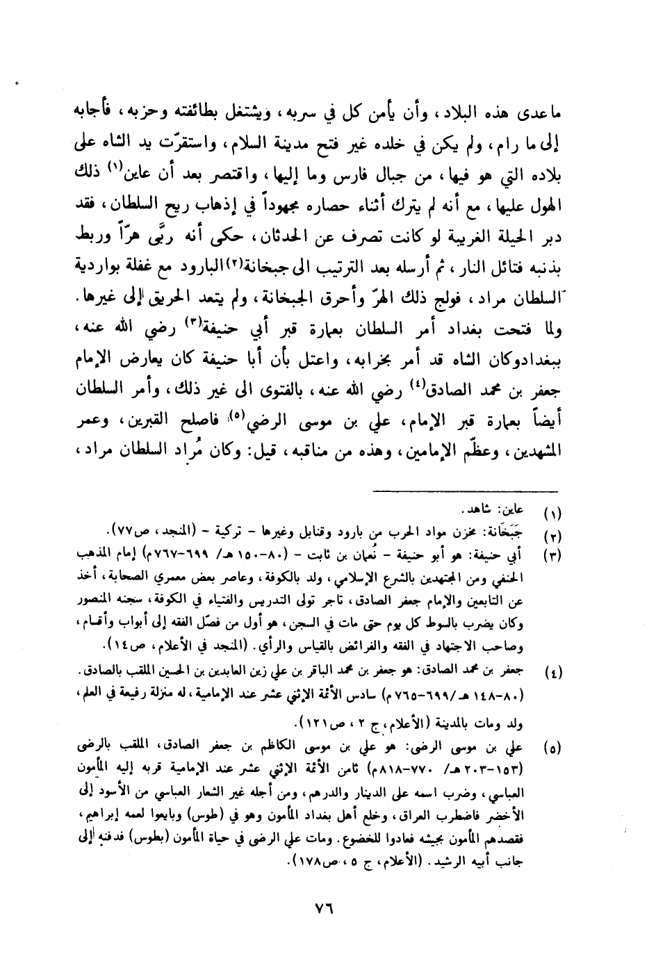 مَا عدى هَذِه الْبِلَاد وَأَن يَأْمَن كل فِي سربه ويشتغل بطائفته وَحزبه فَأَجَابَهُ إِلَى مَا رام وَلم يكن فِي خلده غير فتح مَدِينَة السَّلَام واستقرت يَد الشاه على بِلَاده الَّتِي هُوَ فِيهَا من جبال فَارس وَمَا إِلَيْهَا وَاقْتصر بعد أَن عاين ذَلِك الهول عَلَيْهَا مَعَ أَنه لم يتْرك أثْنَاء حصاره مجهودا فِي إذهاب ريح السُّلْطَان فقد دبر الْحِيلَة الغريبة لَو كَانَت تصرف عَن الْحدثَان حكى أَنه ربى هرا وربط بِذَنبِهِ فتائل النَّار ثمَّ أرْسلهُ بعد التَّرْتِيب الى جبخانة البارود مَعَ غَفلَة بواردية السُّلْطَان مُرَاد فولج ذَلِك الهر وأحرق الجبخانة وَلم يَتَعَدَّ الْحَرِيق إِلَى غَيرهَا وَلما فتحت بَغْدَاد أَمر السُّلْطَان بعمارة قبر أبي حنيفَة رضى الله عَنهُ بِبَغْدَاد وَكَانَ الشاه قد أَمر بخرابه واعتل بِأَن أَبَا حنيفَة كَانَ يُعَارض الإِمَام جَعْفَر بن مُحَمَّد الصَّادِق رضى الله عَنهُ بالفتوى الى غير ذَلِك وَأمر السُّلْطَان أَيْضا بعمارة قبر الإِمَام عَليّ بن مُوسَى الرضي فاصلح القبرين وَعمر المشهدين وَعظم الْإِمَامَيْنِ وَهَذِه من مناقبه قيل وَكَانَ مُرَاد السُّلْطَان مُرَاد