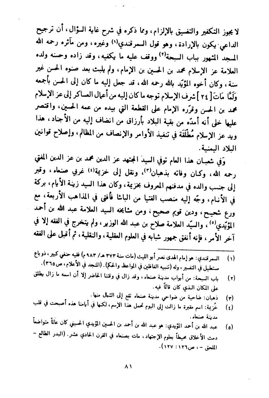 لَا يجوز التَّكْفِير والتفسيق بالإلزام وَمِمَّا ذكره فِي شرح غَايَة السُّؤَال أَن تَرْجِيح الدَّاعِي يكون بالإرادة وَهُوَ قَول السَّمرقَنْدِي وَغَيره وَمن مآثره رَحمَه الله الْمَسْجِد الْمَشْهُور بِبَاب السبحة ووقف عَلَيْهِ مَا يَكْفِيهِ وَقد زَاده وَحسنه وَلَده الْعَلامَة عز الْإِسْلَام مُحَمَّد بن الْحُسَيْن بن الإِمَام وَلم يلبث بعد صنوه الْحسن غير سنة وَكَانَ أَخُوهُ الْمُؤَيد بِاللَّه رَحمَه الله قد جعل إِلَيْهِ مَا كَانَ إِلَى الْحسن بأجمعه وَلما مَاتَ شرف الْإِسْلَام توجه مَا كَانَ إِلَيْهِ من أَعمال العساكر إِلَى عز الْإِسْلَام مُحَمَّد بن الْحسن وَقَررهُ الإِمَام على الْقطعَة الَّتِي بِيَدِهِ من عَمه الْحُسَيْن وَاقْتصر عَلَيْهَا خلى انه أمده من بَقِيَّة الْبِلَاد بأرزاق من انضاف إِلَيْهِ من الأجناد هَذَا وَيَد عز الْإِسْلَام مُطلقَة فِي تَنْفِيذ الْأَوَامِر والإنصاف من الْمَظَالِم وَإِصْلَاح قوانين الْبِلَاد اليمنية