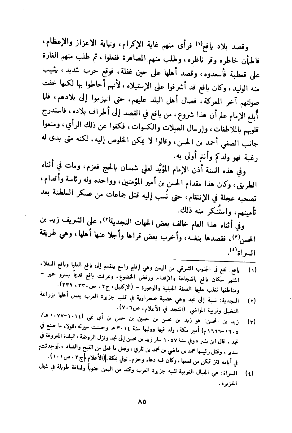 وَقصد بِلَاد يافع فَرَأى مِنْهُم غَايَة الْإِكْرَام وَنِهَايَة الاعزاز والإعظام فاطمأن خاطره وقر ناظره وَطلب مِنْهُم الْمُصَاهَرَة فَفَعَلُوا ثمَّ طلب مِنْهُم الْغَارة على قعطبة فاسعدوه وَقصد أَهلهَا على حِين غَفلَة فَوَقع حَرْب شَدِيد يشيب مِنْهُ الْوَلِيد وَكَانَ يافع قد أشرفوا على الإستيلاء لأَنهم أحاطوا بهَا لَكِنَّهَا خفت صولتهم آخر المعركة فصَال أهل الْبَلَد عَلَيْهِم حَتَّى انْهَزمُوا إِلَى بِلَادهمْ فَلَمَّا أبلغ الإِمَام علم أَن هَذَا شُرُوع من يافع فِي الْقَصْد إِلَى أَطْرَاف بِلَاده فاستدرج قُلُوبهم بالملاطفات وإرسال الصلات والكسوات فكفوا عَن ذَلِك الرَّأْي وَمنعُوا جَانب الصفي أَحْمد بن الْحسن وَقَالُوا لَا يُمكن الخلوص إِلَيْهِ لكنه مَتى بدى لَهُ رَغْبَة فَهُوَ ولدكم وَأَنْتُم أولى بِهِ