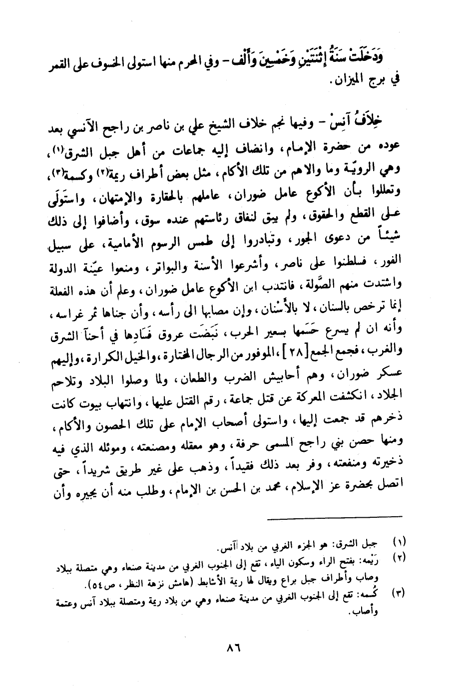 خلاف آنس وفيهَا نجم خلاف الشَّيْخ عَليّ بن نَاصِر بن رَاجِح الآنسي بعد عوده من حَضْرَة الإِمَام وانضاف إِلَيْهِ جماعات من أهل جبل الشرق وَهِي الروية وَمَا والاهم من تِلْكَ الأكام مثل بعض أَطْرَاف ريمة وكسمة وتعللوا بِأَن الْأَكْوَع عَامل ضوران عاملهم بالحقارة والإمتهان وَاسْتولى على الْقطع والحقوق وَلم يبْق لنفاق رئاستهم عِنْده سوق وأضافوا إِلَى ذَلِك شَيْئا من دَعْوَى الْجور وتبادروا إِلَى طمس الرسوم الأمامية على سَبِيل الْفَوْر فسلطنوا على نَاصِر وأشرعوا الأسنة والبواتر وَمنعُوا عينة الدولة واشتدت مِنْهُم الصولة فَانْتدبَ ابْن الْأَكْوَع عَامل ضوران وَعلم أَن هَذِه الفعلة إِنَّمَا ترخص بِالسِّنَانِ لَا بالأسنان وَإِن مصابها الى رَأسه وَأَن جناها ثَمَر غراسه وَأَنه ان لم يسْرع حسمها بسعير الْحَرْب نبضت عروق فَسَادهَا فِي احنا الشرق والغرب فَجمع الْجمع الموفور من الرِّجَال المختارة وَالْخَيْل الكرارة وإليهم عَسْكَر ضوران وهم أحابيش الضَّرْب والطعان وَلما وصلوا الْبِلَاد وتلاحم الجلاد انكشفت المعركة عَن قتل جمَاعَة رقم الْقَتْل عَلَيْهَا وانتهاب بيُوت كَانَت ذخرهم قد جمعت إِلَيْهَا وَاسْتولى أَصْحَاب الإِمَام على تِلْكَ الْحُصُون والأكام وَمِنْهَا حصن بني رَاجِح الْمُسَمّى حِرْفَة وَهُوَ معقلة ومصنعته وموئله الَّذِي فِيهِ ذخيرته ومنفعته وفر بعد ذَلِك فقيدا وَذهب على غير طَرِيق شَرِيدًا حَتَّى اتَّصل بِحَضْرَة عز الْإِسْلَام مُحَمَّد بن الْحسن بن الإِمَام وَطلب مِنْهُ أَن يجيره وَأَن