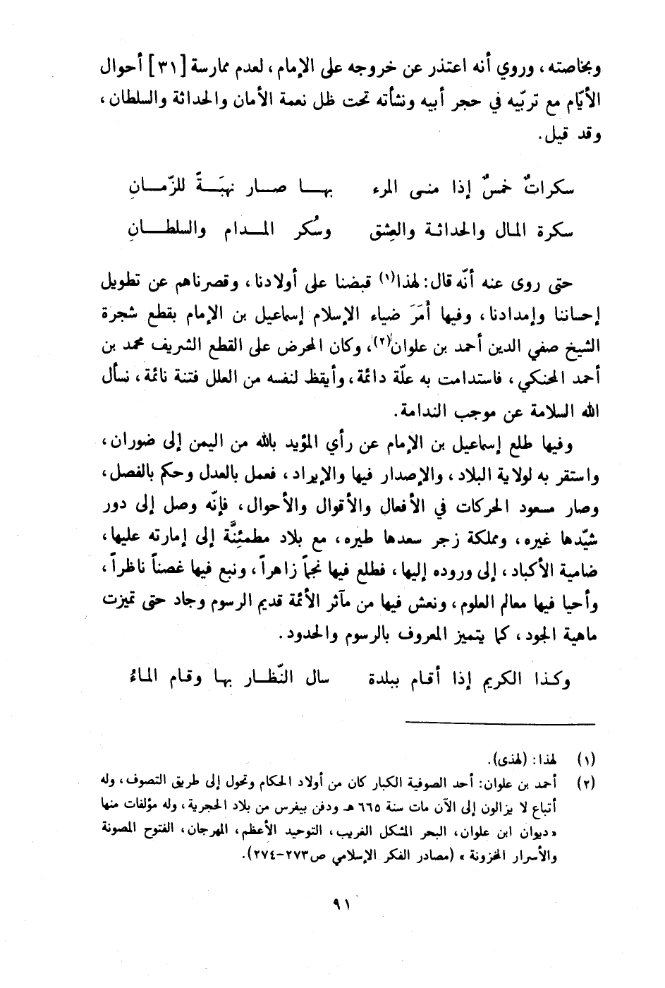 وفيهَا طلع إِسْمَاعِيل بن الإِمَام عَن رَأْي الْمُؤَيد بِاللَّه من الْيمن إِلَى ضوران وَاسْتقر بِهِ لولاية الْبِلَاد والإصدار فِيهَا والإيراد فَعمل بِالْعَدْلِ وَحكم بِالْفَصْلِ وَصَارَ مَسْعُود الحركات فِي الْأَفْعَال والأقوال وَالْأَحْوَال فَإِنَّهُ وصل إِلَى دور شيدها غَيره ومملكة زجر سعدها طيره مَعَ بِلَاد مطمئنة إِلَى إمارته عَلَيْهَا ضامية الأكباد إِلَى وُرُوده إِلَيْهَا فطلع فِيهَا نجما زاهرا ونبع فِيهَا غصنا نَاظرا وَأَحْيَا فِيهَا معالم الْعُلُوم ونعش فِيهَا من مآثر الْأَئِمَّة قديم الرسوم وجاد حَتَّى تميزت مَاهِيَّة الْجُود كَمَا يتَمَيَّز الْمَعْرُوف بالرسوم وَالْحُدُود