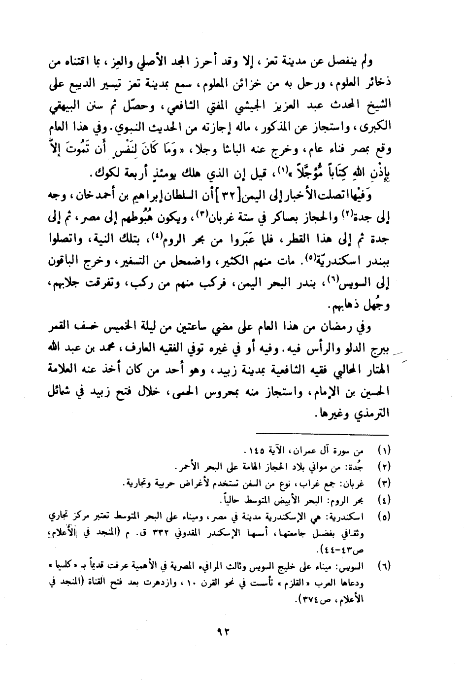وَلم ينْفَصل عَن مَدِينَة تعز إِلَّا وَقد أحرز الْمجد الْأَصْلِيّ والعز بِمَا اقتناه من ذخائر الْعُلُوم ورحل بِهِ من خَزَائِن الْمَعْلُوم سمع بِمَدِينَة تعز تيسير الديبع على الشَّيْخ الْمُحدث عبد الْعَزِيز الجيشي الْمُفْتِي الشَّافِعِي وَحصل ثمَّ سنَن الْبَيْهَقِيّ الْكُبْرَى واستجاز عَن الْمَذْكُور مَاله إِجَازَته من الحَدِيث النَّبَوِيّ وَفِي هَذَا الْعَام وَقع بِمصْر فنَاء عَام وَخرج عَنهُ الباشا وجلا {وَمَا كَانَ لنَفس أَن تَمُوت إِلَّا بِإِذن الله كتابا مُؤَجّلا} قيل إِن الَّذِي هلك يَوْمئِذٍ أَرْبَعَة لكوك